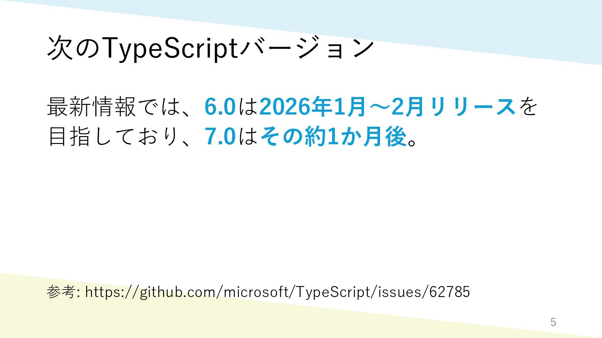 次のTypeScriptバージョン 最新情報では、6.0は2026年1月~2月リリースを 目指しており、7.0はその約1か月後。 参考: https://github.com/microsoft/TypeScript/issues/62785 5