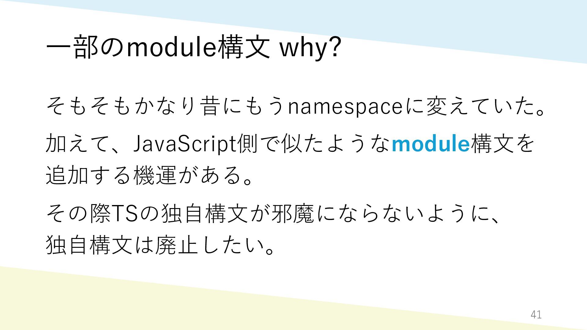 一部のmodule構文 why? そもそもかなり昔にもうnamespaceに変えていた。 加えて、JavaScript側で似たようなmodule構文を 追加する機運がある。 その際TSの独自構文が邪魔にならないように、 独自構文は廃止したい。 41