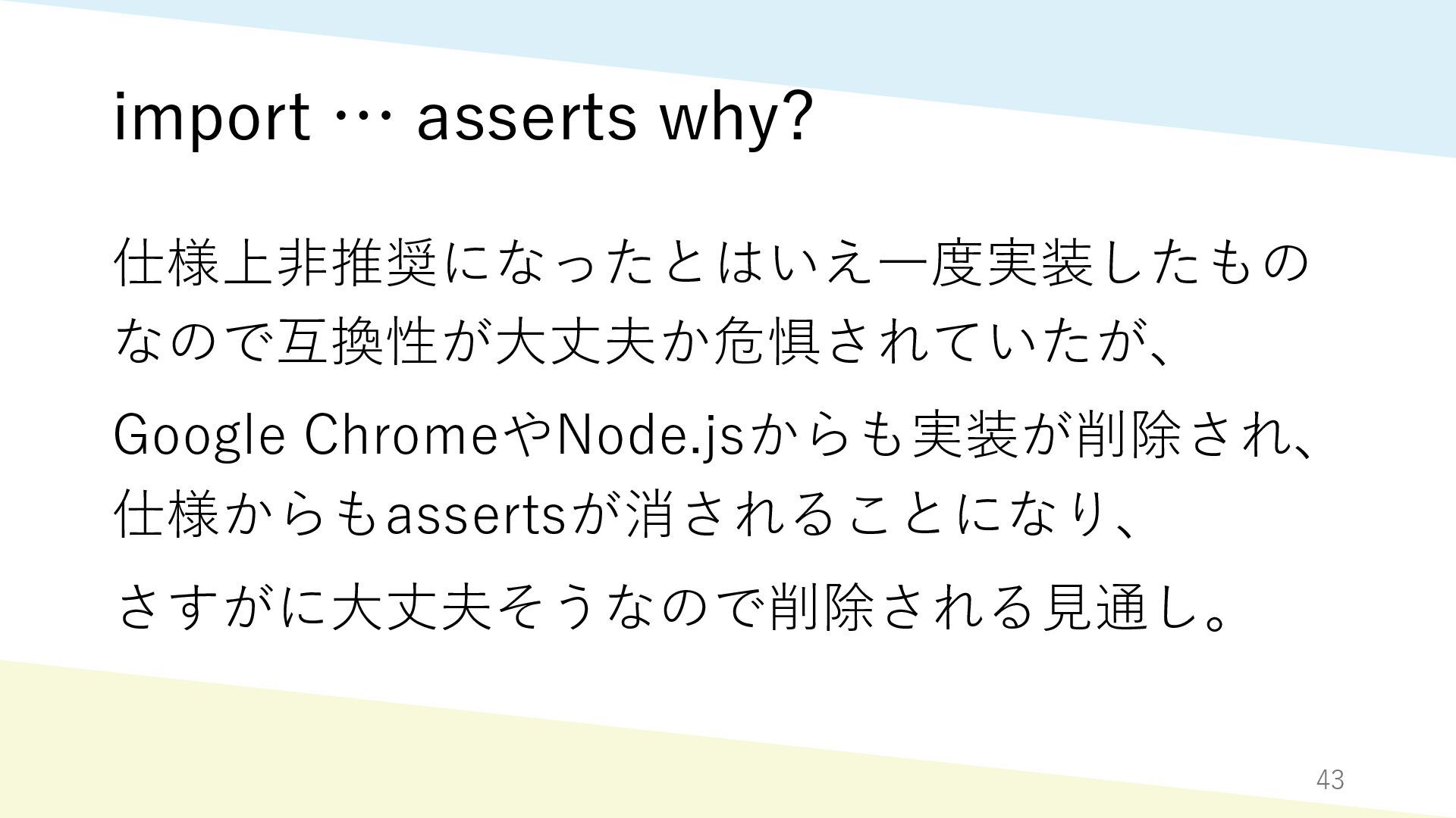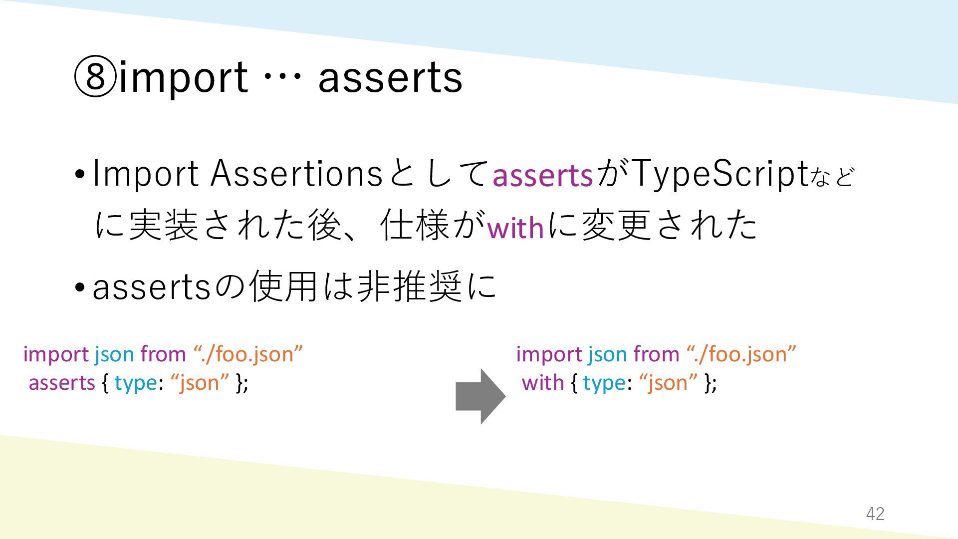 ⑧import … asserts •Import AssertionsとしてassertsがTypeScriptなど に実装された後、仕様がwithに変更された •assertsの使用は非推奨に 42 import json