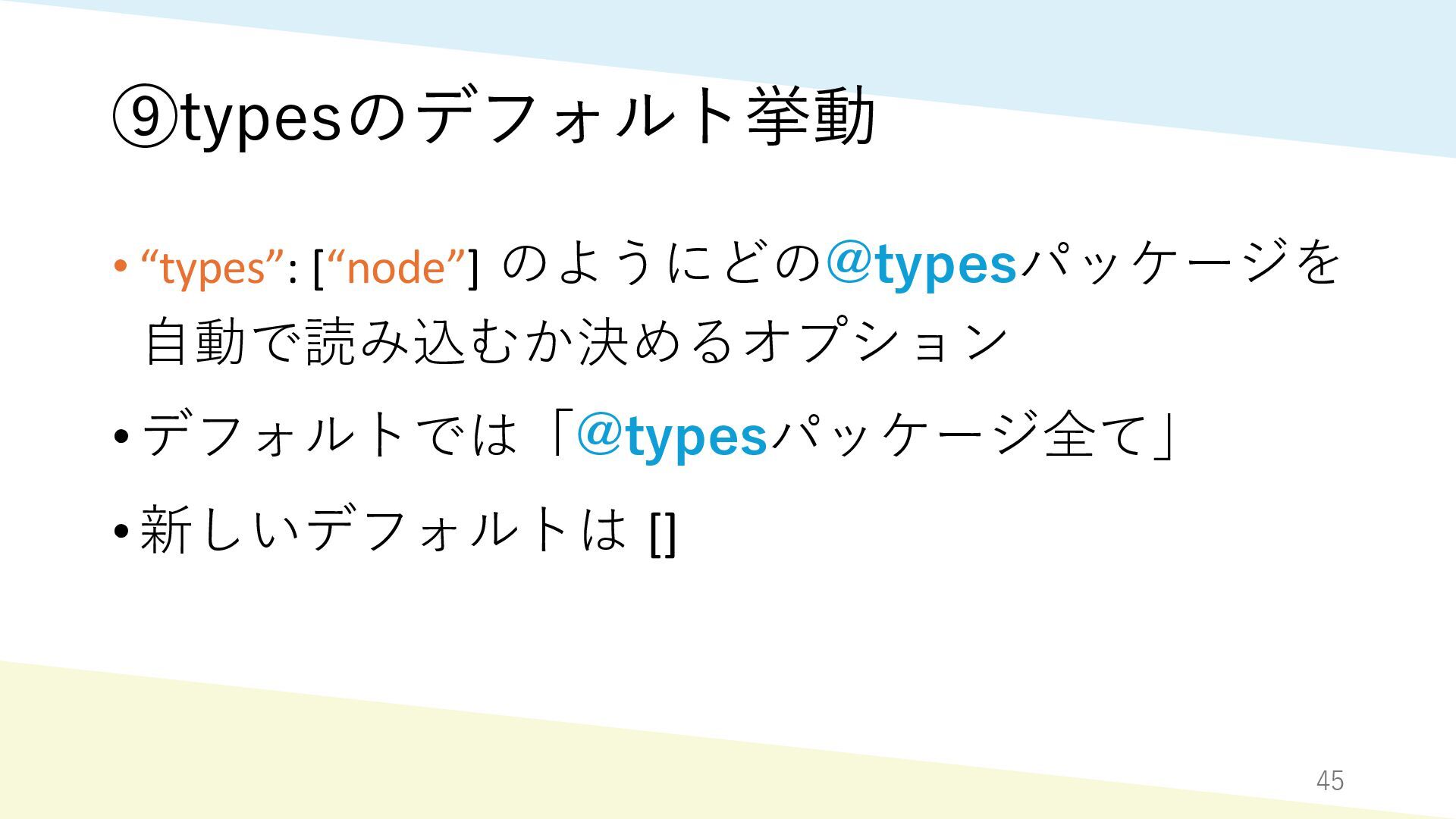 ⑨typesのデフォルト挙動 • “types”: [“node”] のようにどの@typesパッケージを 自動で読み込むか決めるオプション •デフォルトでは「@typesパッケージ全て」 •新しいデフォルトは [] 45