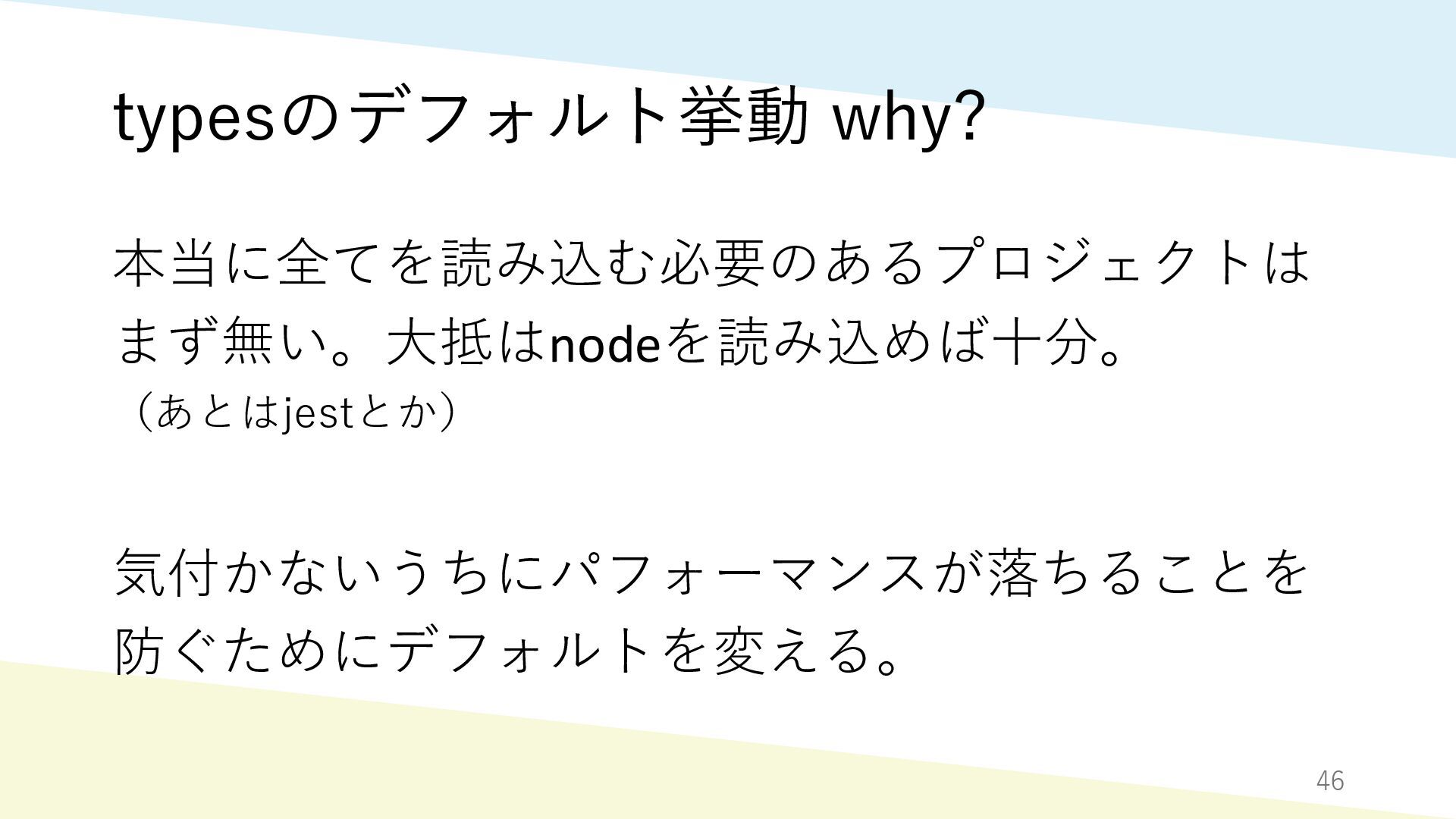 typesのデフォルト挙動 why? 本当に全てを読み込む必要のあるプロジェクトは まず無い。大抵はnodeを読み込めば十分。 (あとはjestとか) 気付かないうちにパフォーマンスが落ちることを 防ぐためにデフォルトを変える。 46