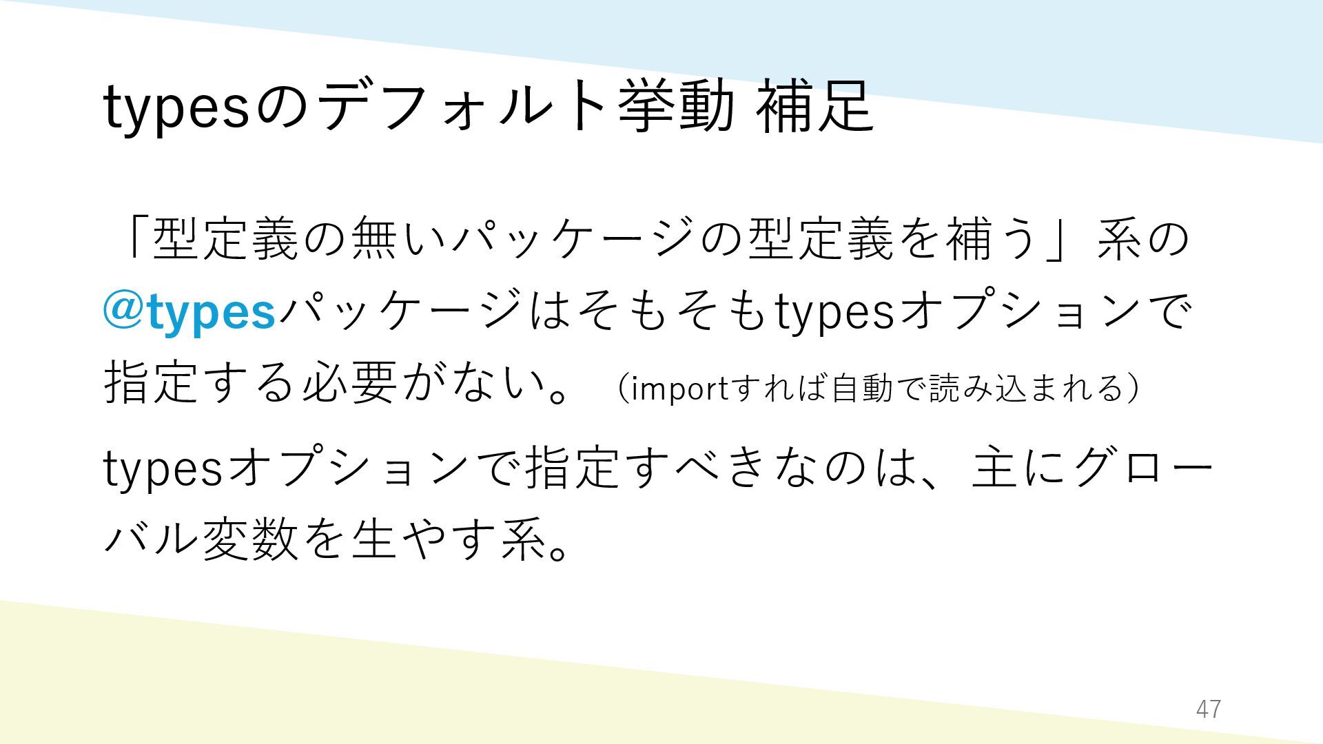 typesのデフォルト挙動 補足 「型定義の無いパッケージの型定義を補う」系の @typesパッケージはそもそもtypesオプションで 指定する必要がない。(importすれば自動で読み込まれる) typesオプションで指定すべきなのは、主にグロー バル変数を生やす系。 47