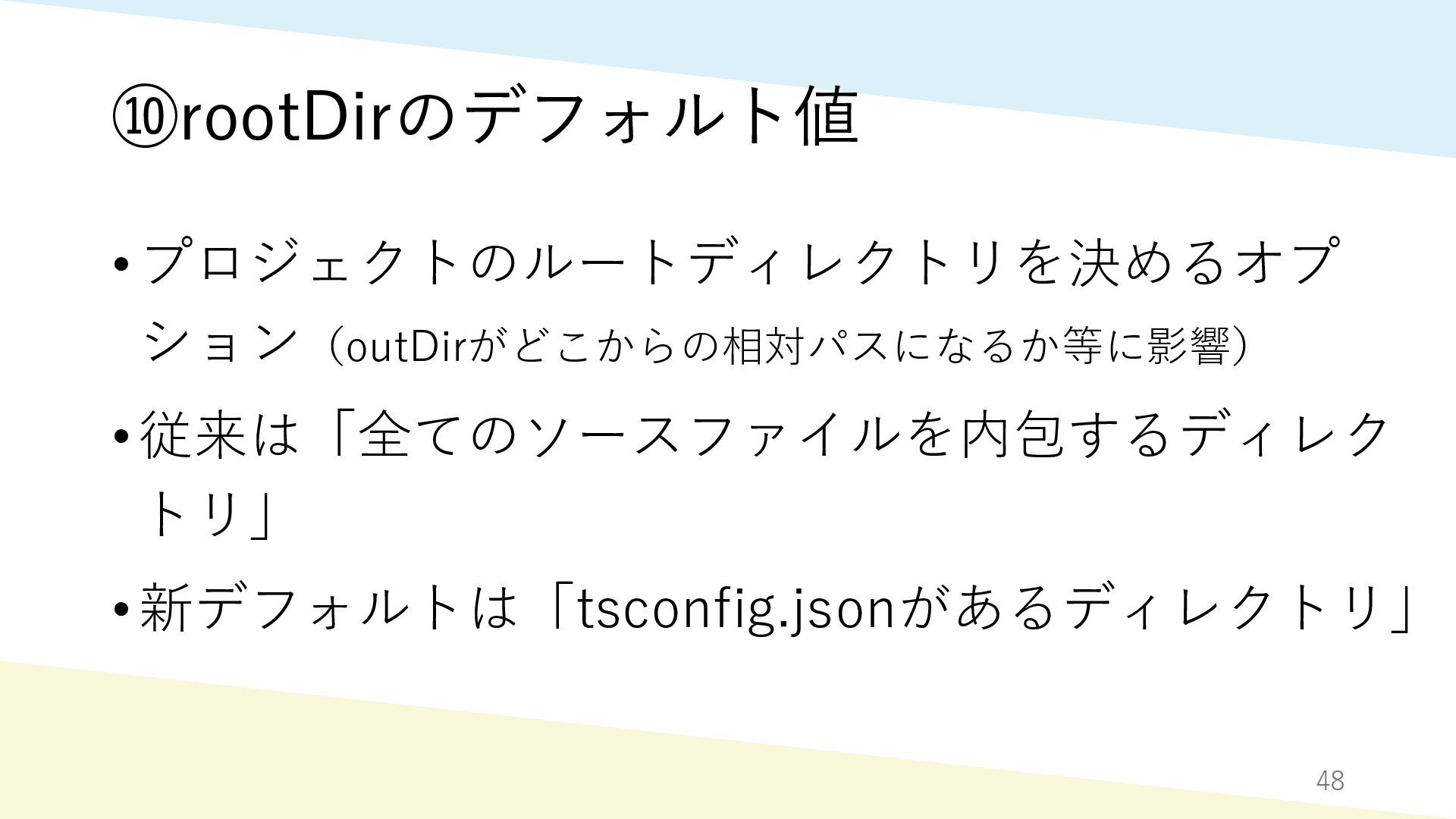 ⑩rootDirのデフォルト値 •プロジェクトのルートディレクトリを決めるオプ ション(outDirがどこからの相対パスになるか等に影響) •従来は「全てのソースファイルを内包するディレク トリ」 •新デフォルトは「tsconfig.jsonがあるディレクトリ」 48