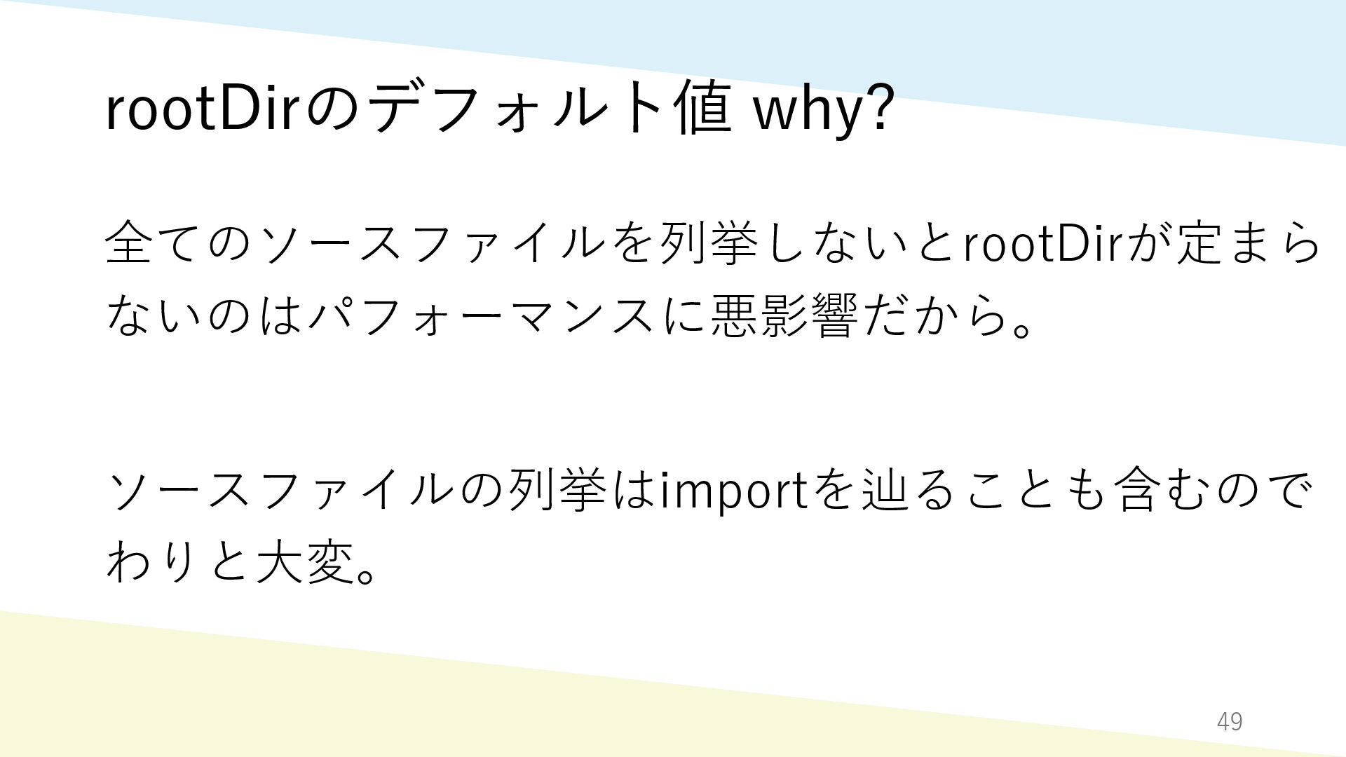 rootDirのデフォルト値 why? 全てのソースファイルを列挙しないとrootDirが定まら ないのはパフォーマンスに悪影響だから。 ソースファイルの列挙はimportを辿ることも含むので わりと大変。 49