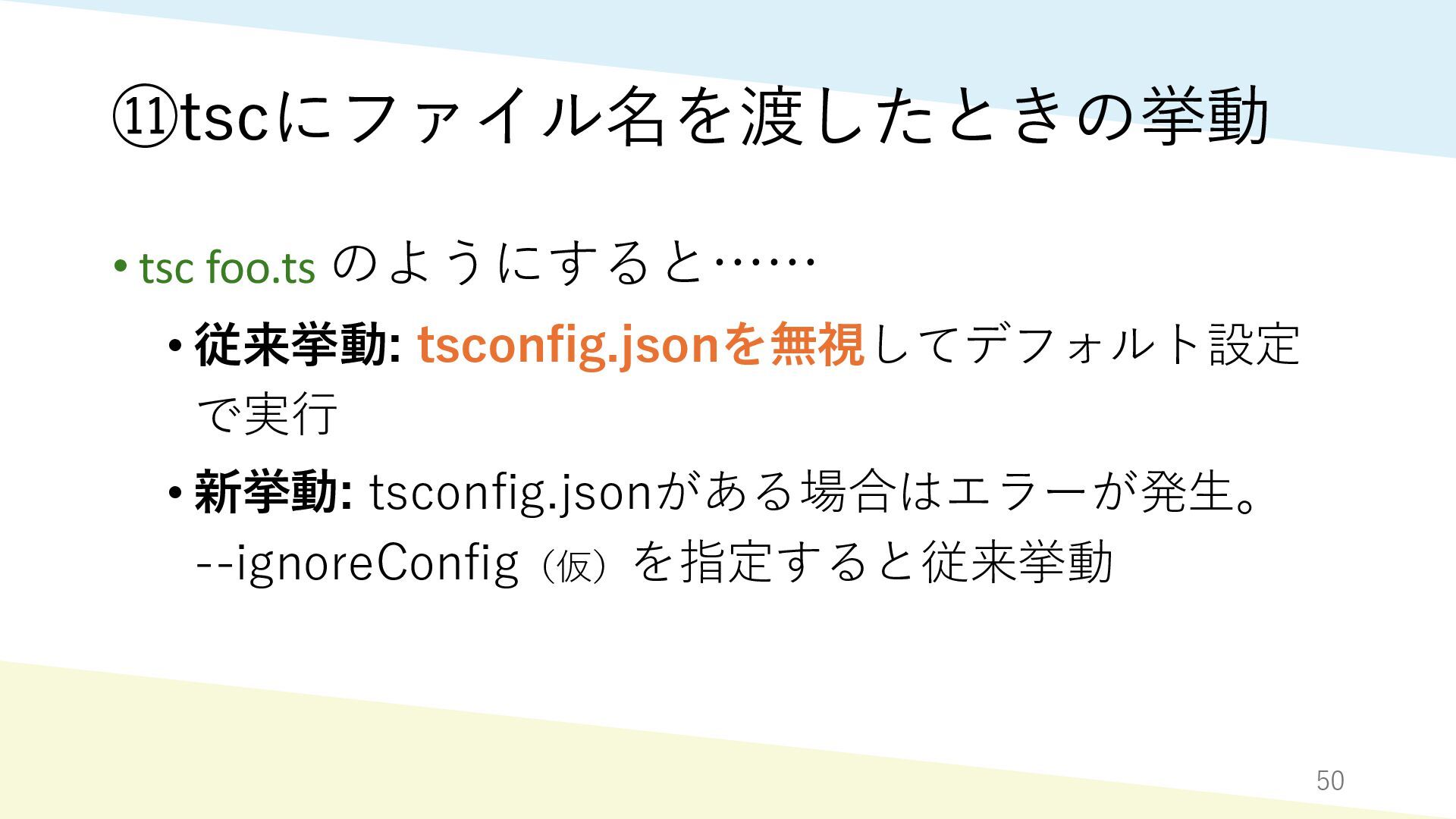 ⑪tscにファイル名を渡したときの挙動 • tsc foo.ts のようにすると…… • 従来挙動: tsconfig.jsonを無視してデフォルト設定 で実行 •