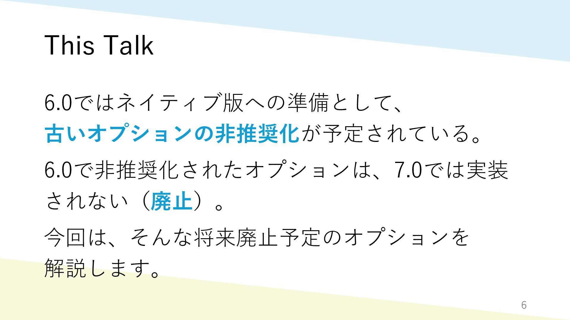 This Talk 6.0ではネイティブ版への準備として、 古いオプションの非推奨化が予定されている。 6.0で非推奨化されたオプションは、7.0では実装 されない(廃止)。 今回は、そんな将来廃止予定のオプションを 解説します。 6