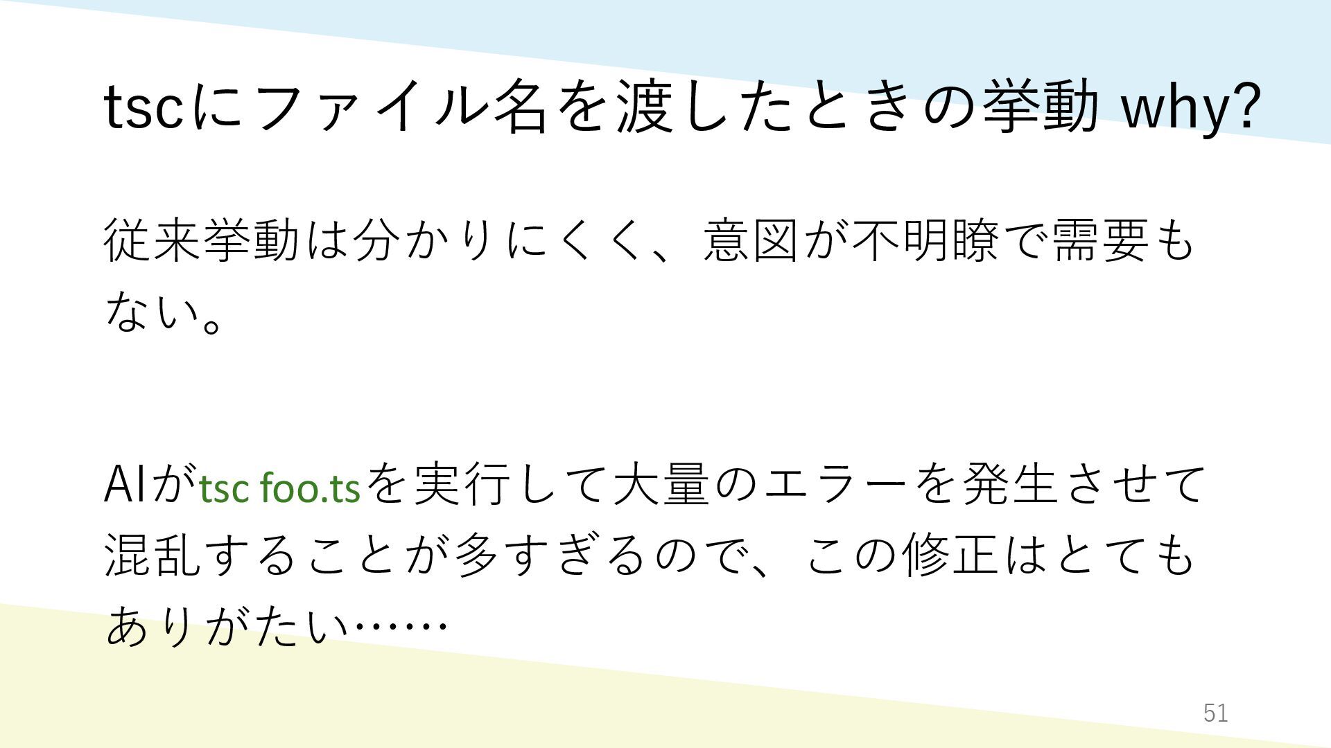 tscにファイル名を渡したときの挙動 why? 従来挙動は分かりにくく、意図が不明瞭で需要も ない。 AIがtsc foo.tsを実行して大量のエラーを発生させて 混乱することが多すぎるので、この修正はとても ありがたい…… 51