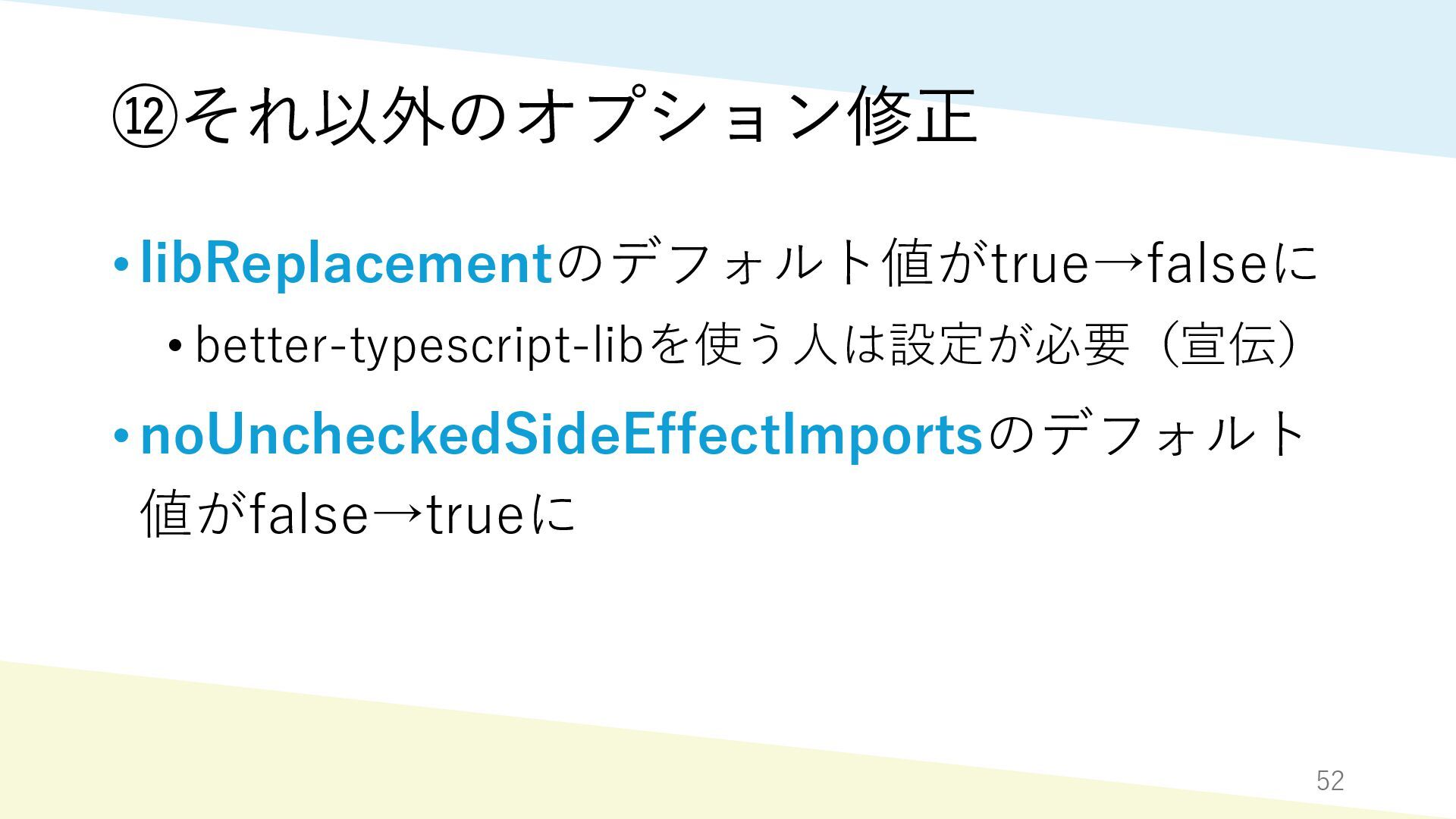 ⑫それ以外のオプション修正 •libReplacementのデフォルト値がtrue→falseに • better-typescript-libを使う人は設定が必要(宣伝) •noUncheckedSideEffectImportsのデフォルト 値がfalse→trueに 52