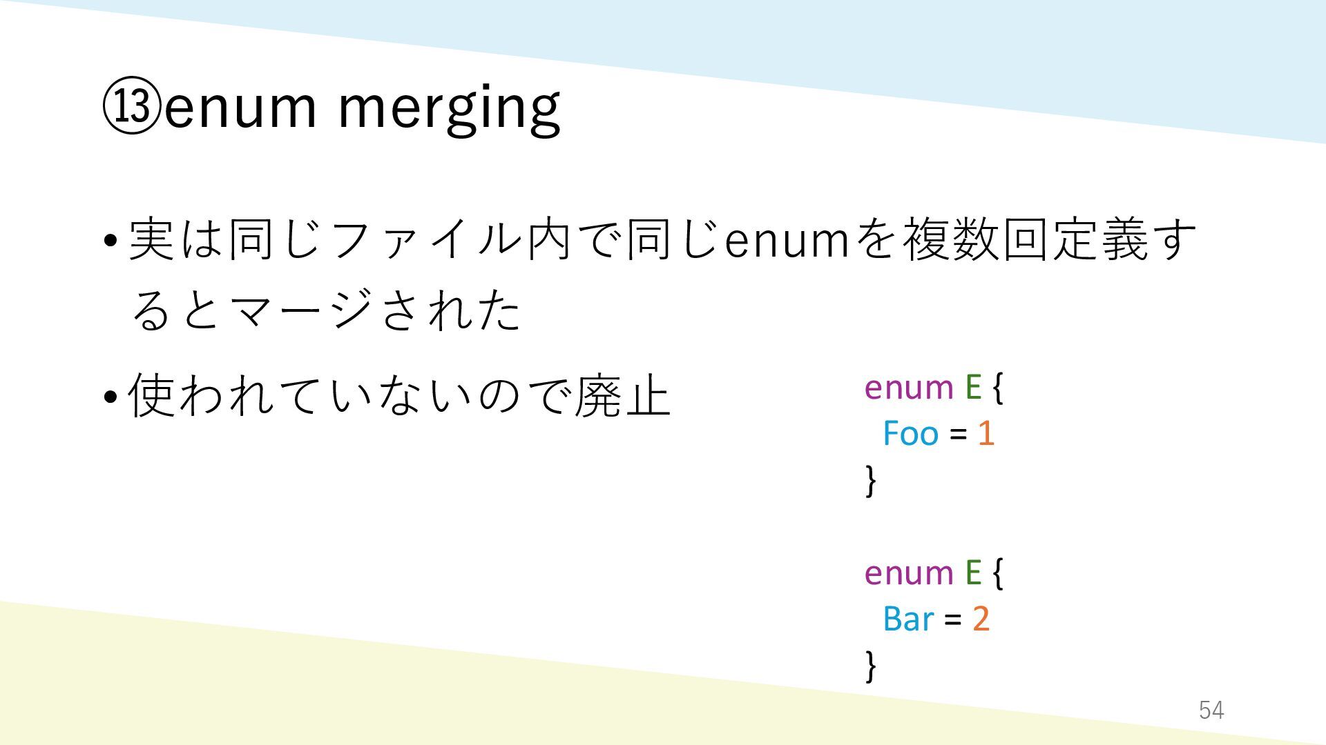 ⑬enum merging •実は同じファイル内で同じenumを複数回定義す るとマージされた •使われていないので廃止 54 enum E { Foo