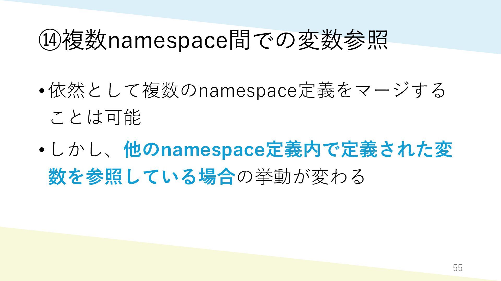 ⑭複数namespace間での変数参照 •依然として複数のnamespace定義をマージする ことは可能 •しかし、他のnamespace定義内で定義された変 数を参照している場合の挙動が変わる 55