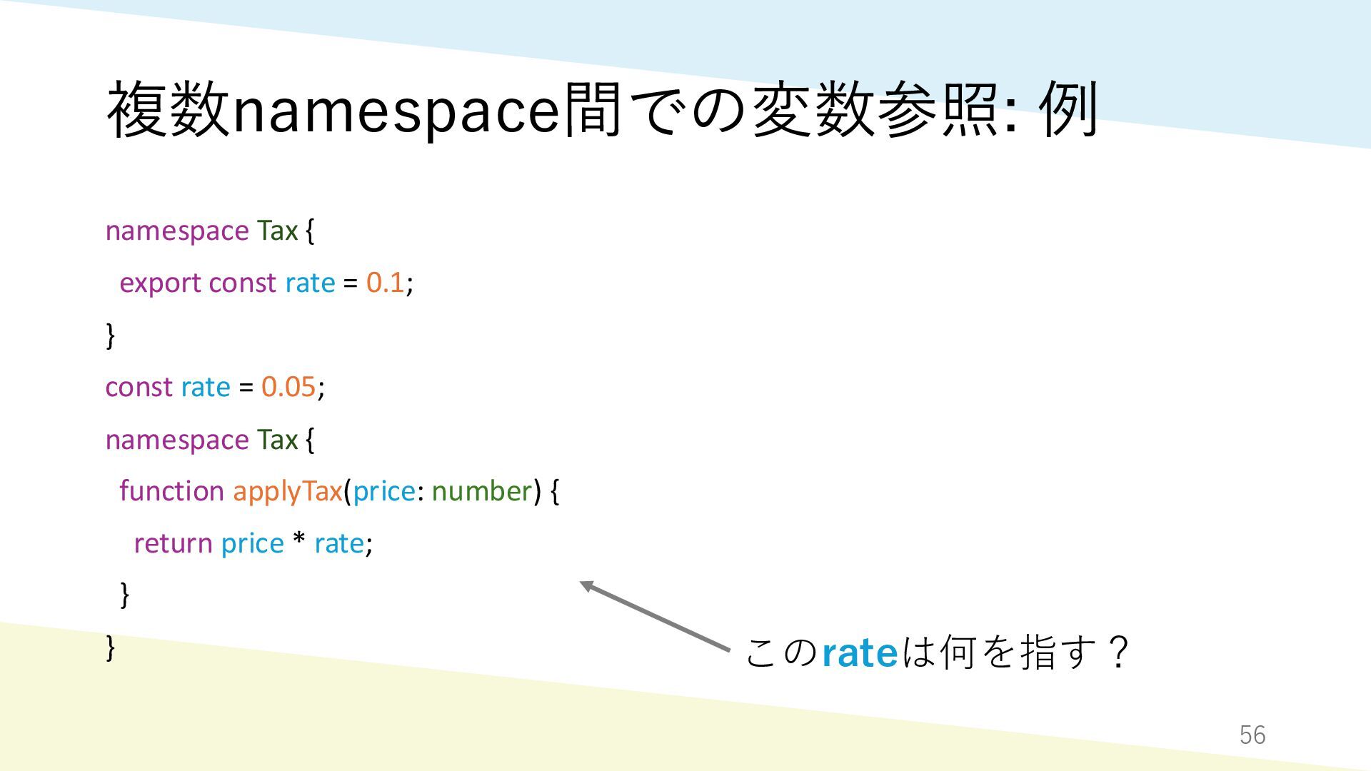 } const rate = 0.05; namespace Tax { function applyTax(price: number) { return price * rate; } } 56 このrateは何を指す?