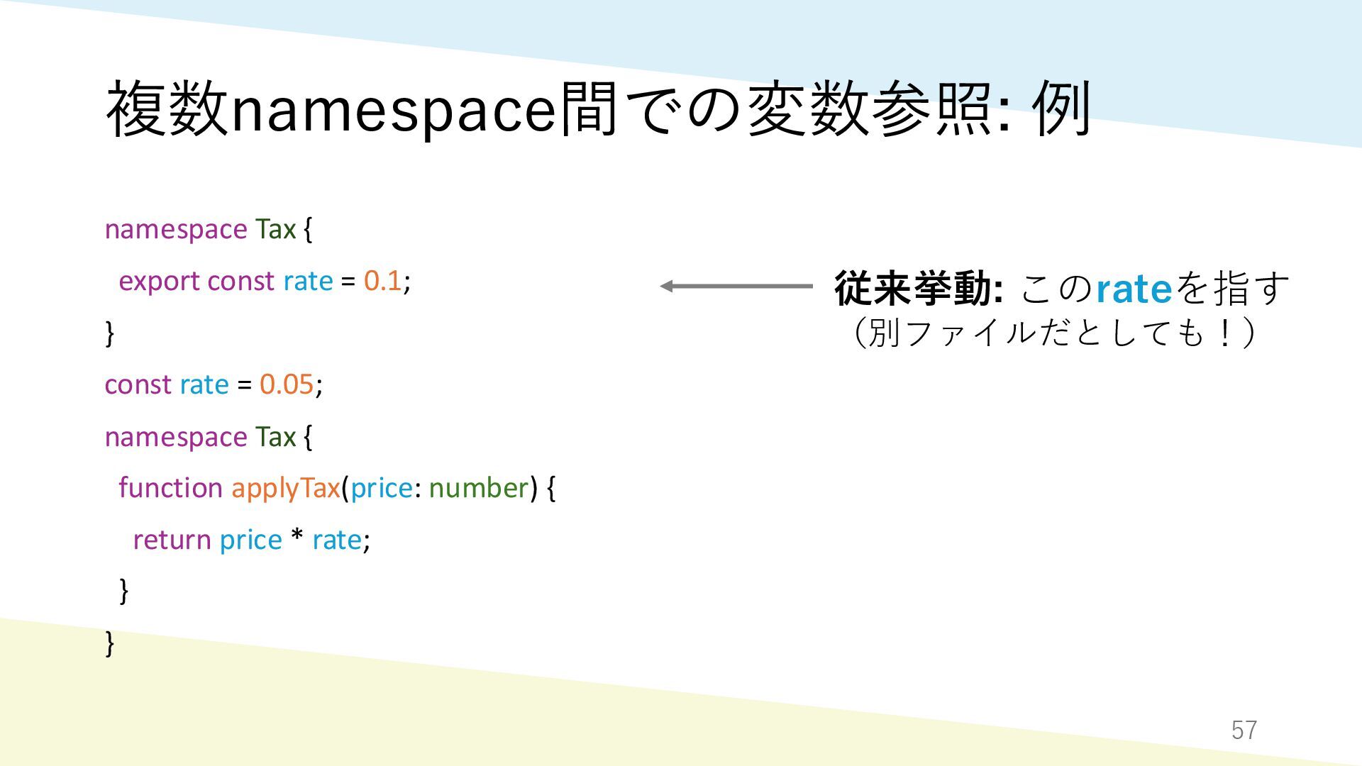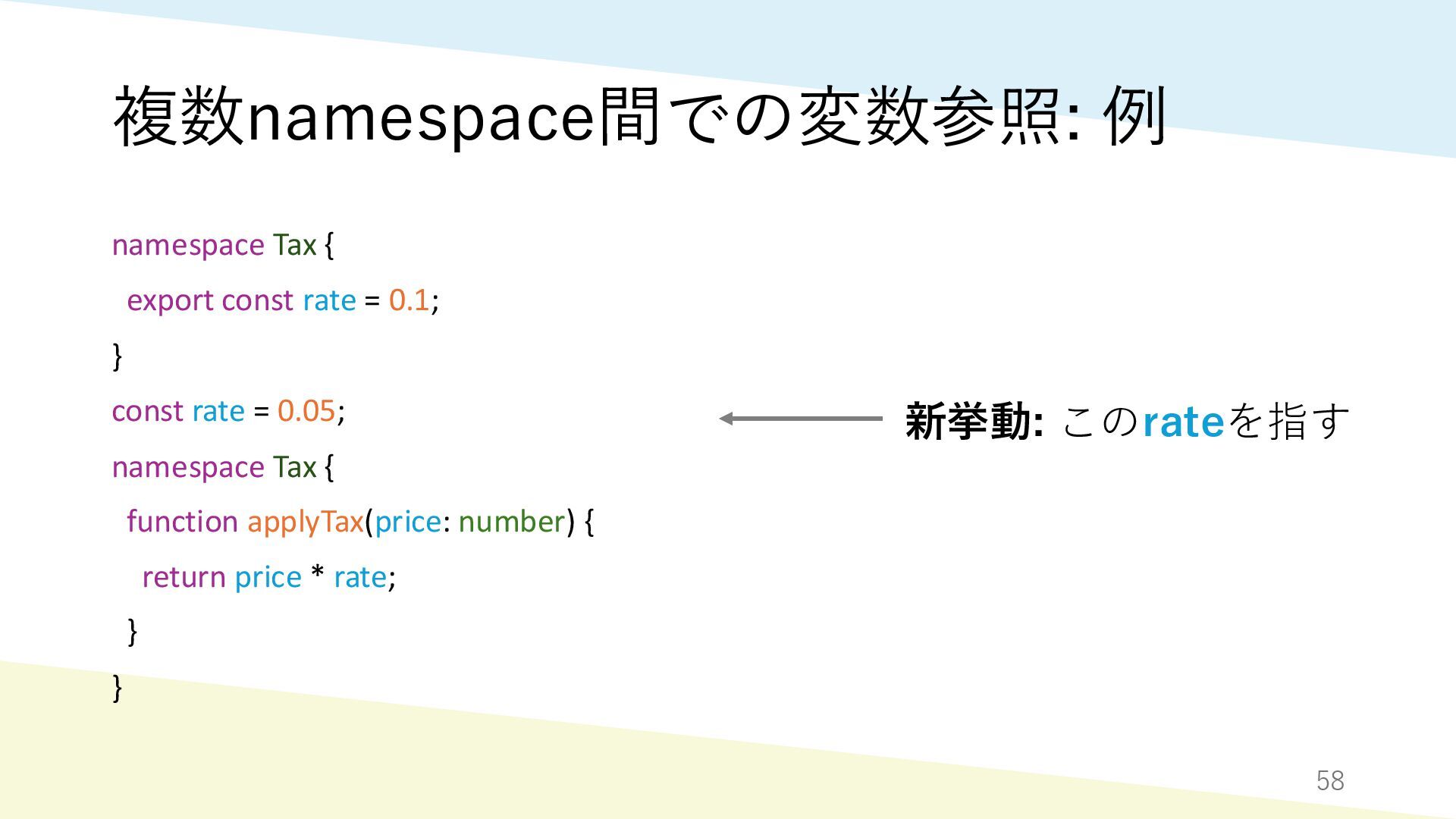 } const rate = 0.05; namespace Tax { function applyTax(price: number) { return price * rate; } } 57 従来挙動: このrateを指す (別ファイルだとしても!)