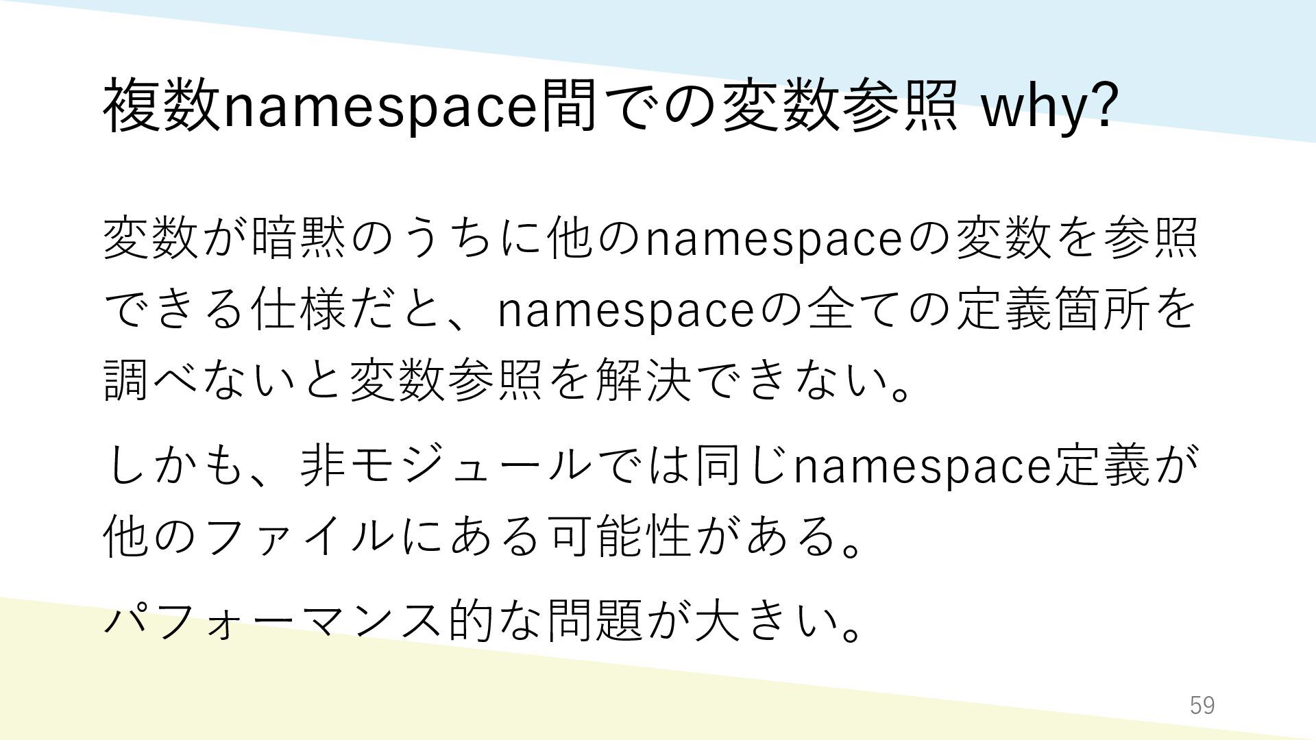 複数namespace間での変数参照 why? 変数が暗黙のうちに他のnamespaceの変数を参照 できる仕様だと、namespaceの全ての定義箇所を 調べないと変数参照を解決できない。 しかも、非モジュールでは同じnamespace定義が 他のファイルにある可能性がある。 パフォーマンス的な問題が大きい。 59