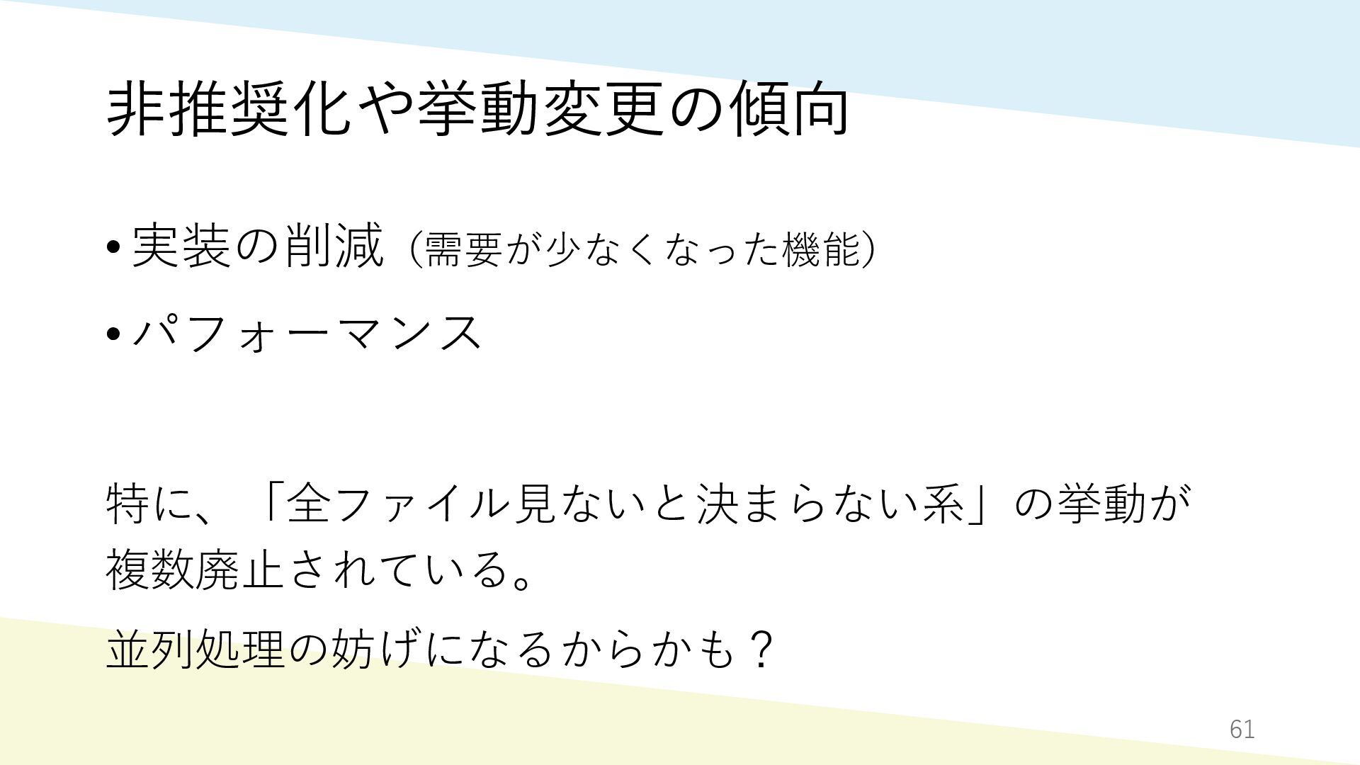 非推奨化や挙動変更の傾向 •実装の削減(需要が少なくなった機能) •パフォーマンス 特に、「全ファイル見ないと決まらない系」の挙動が 複数廃止されている。 並列処理の妨げになるからかも? 61