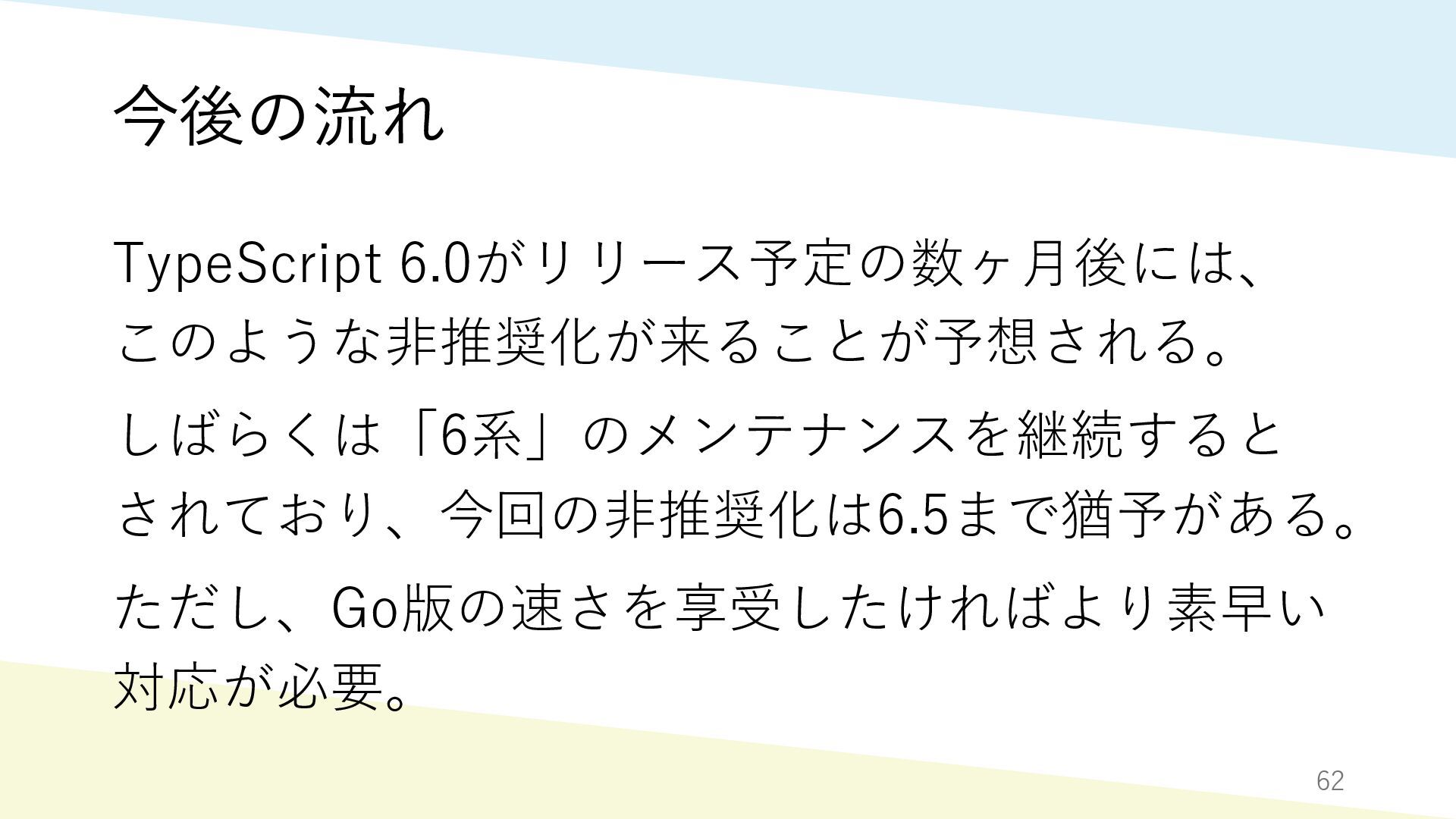 今後の流れ TypeScript 6.0がリリース予定の数ヶ月後には、 このような非推奨化が来ることが予想される。 しばらくは「6系」のメンテナンスを継続すると されており、今回の非推奨化は6.5まで猶予がある。 ただし、Go版の速さを享受したければより素早い 対応が必要。 62