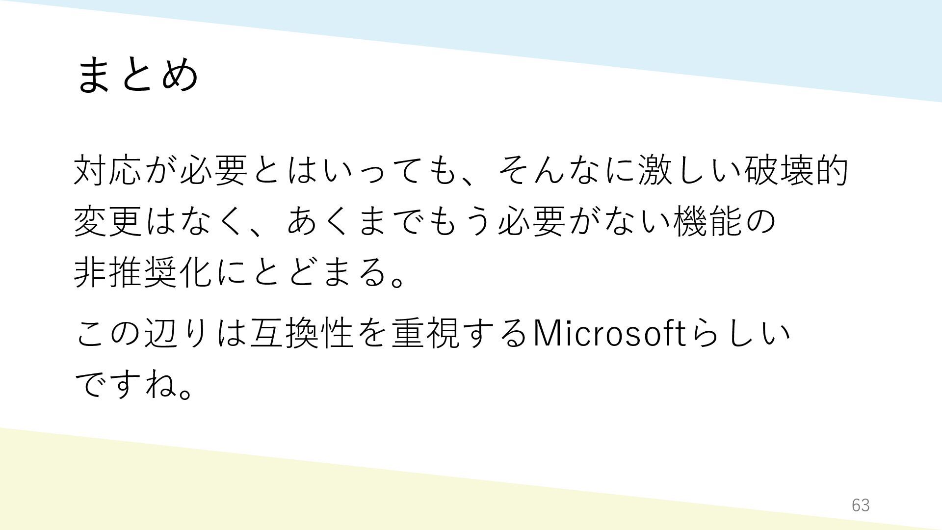 まとめ 対応が必要とはいっても、そんなに激しい破壊的 変更はなく、あくまでもう必要がない機能の 非推奨化にとどまる。 この辺りは互換性を重視するMicrosoftらしい ですね。 63