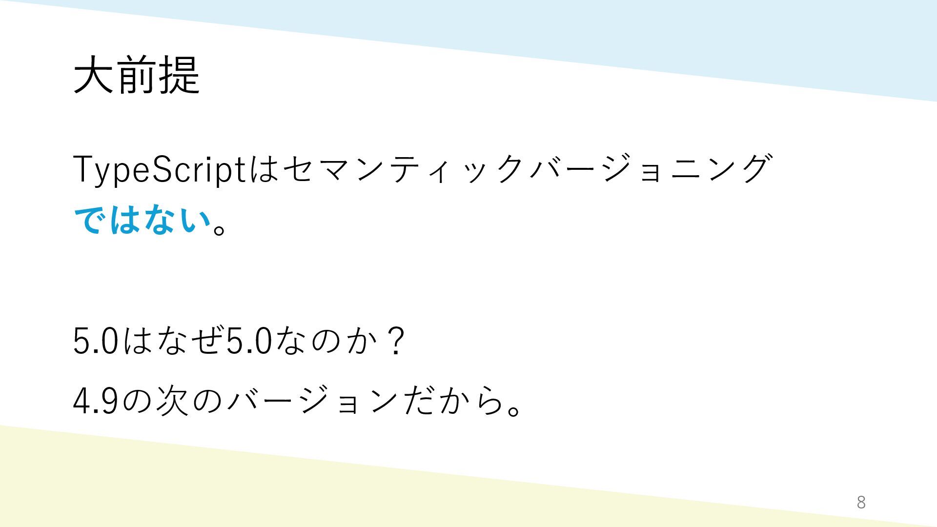 大前提 TypeScriptはセマンティックバージョニング ではない。 5.0はなぜ5.0なのか? 4.9の次のバージョンだから。 8