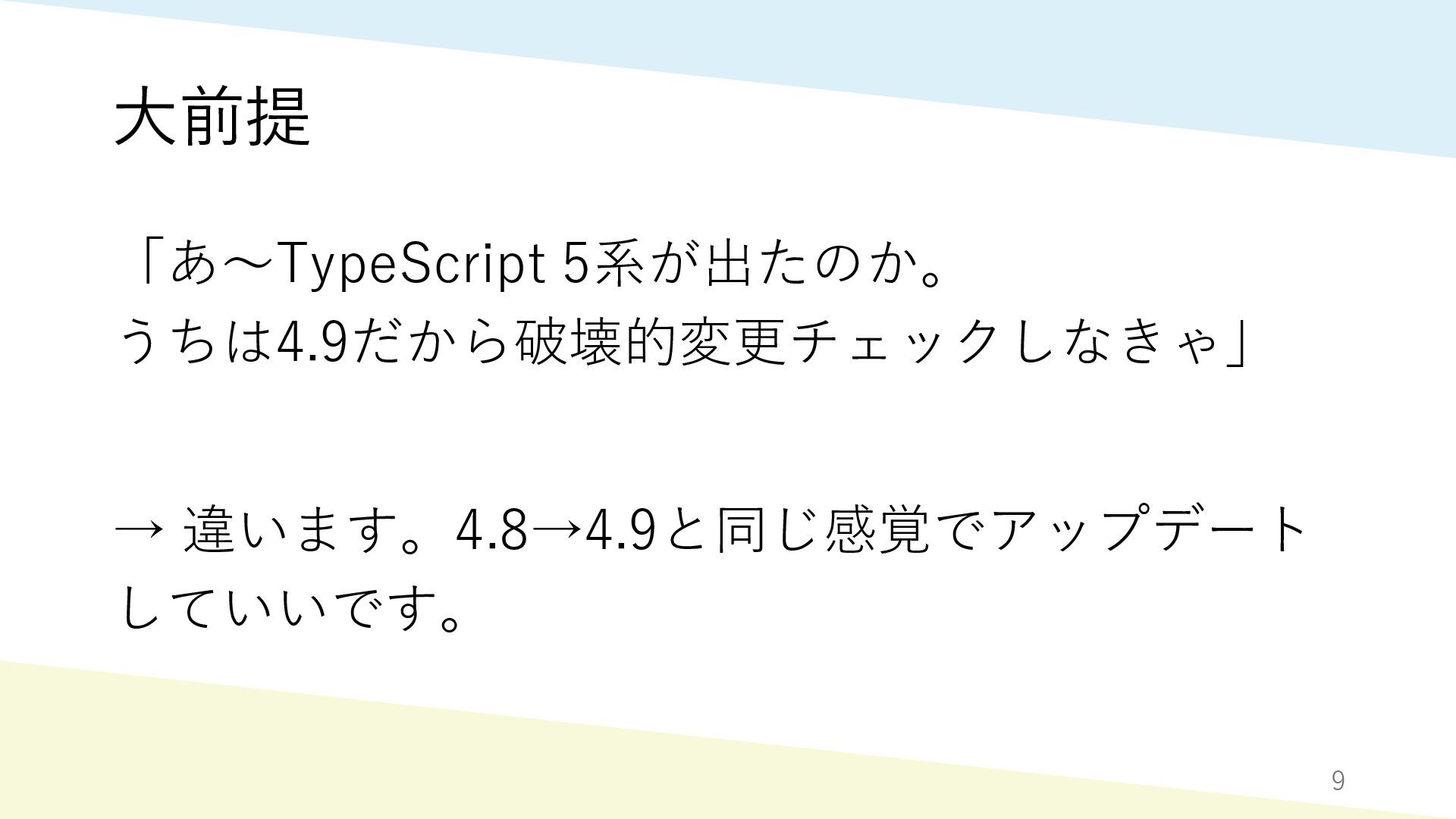 大前提 「あ~TypeScript 5系が出たのか。 うちは4.9だから破壊的変更チェックしなきゃ」 → 違います。4.8→4.9と同じ感覚でアップデート していいです。 9