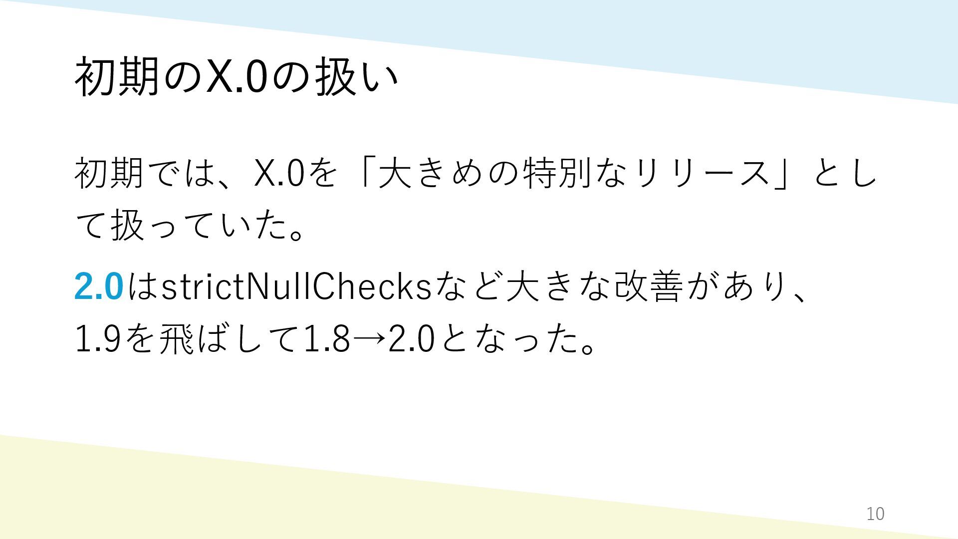 初期のX.0の扱い 初期では、X.0を「大きめの特別なリリース」とし て扱っていた。 2.0はstrictNullChecksなど大きな改善があり、 1.9を飛ばして1.8→2.0となった。 10