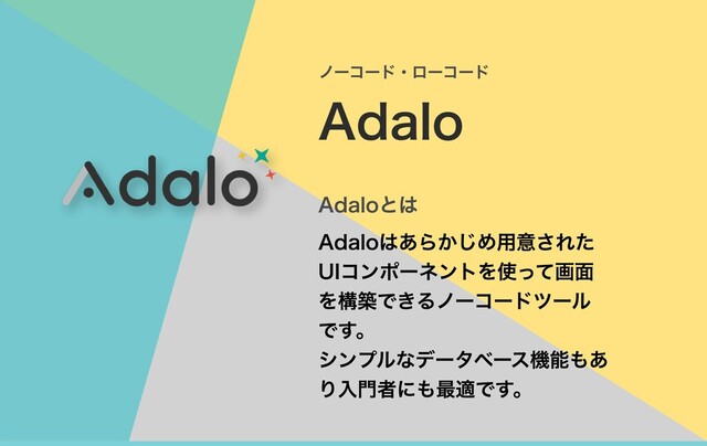 Adaloとは ノーコード・ローコード Adalo Adaloはあらかじめ用意された UIコンポーネントを使って画面 を構築できるノーコードツール です。 シンプルなデータベース機能もあ り入門者にも最適です。