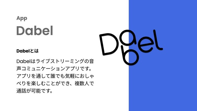 App Dabel Dabelはライブストリーミングの音 声コミュニケーションアプリです。 アプリを通して誰でも気軽におしゃ べりを楽しむことができ、複数人で 通話が可能です。 Dabelとは