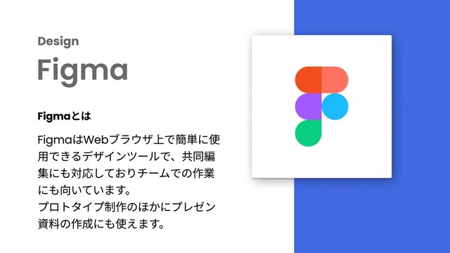 Design Figma FigmaはWebブラウザ上で簡単に使 用できるデザインツールで、共同編 集にも対応しておりチームでの作業 にも向いています。 プロトタイプ制作のほかにプレゼン 資料の作成にも使えます。 Figmaとは