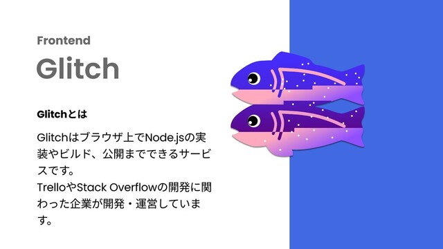 Frontend Glitch Glitchはブラウザ上でNode.jsの実 装やビルド、公開までできるサービ スです。 TrelloやStack Overflowの開発に関 わった企業が開発・運営していま す。 Glitchとは