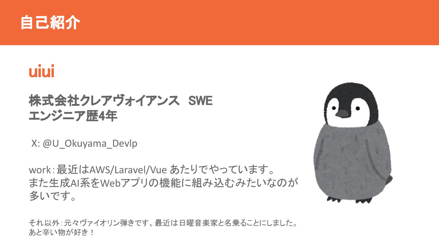 株式会社クレアヴォイアンス SWE エンジニア歴4年 自己紹介 uiui X: @U_Okuyama_Devlp work:最近はAWS/Laravel/Vue あたりでやっています。
