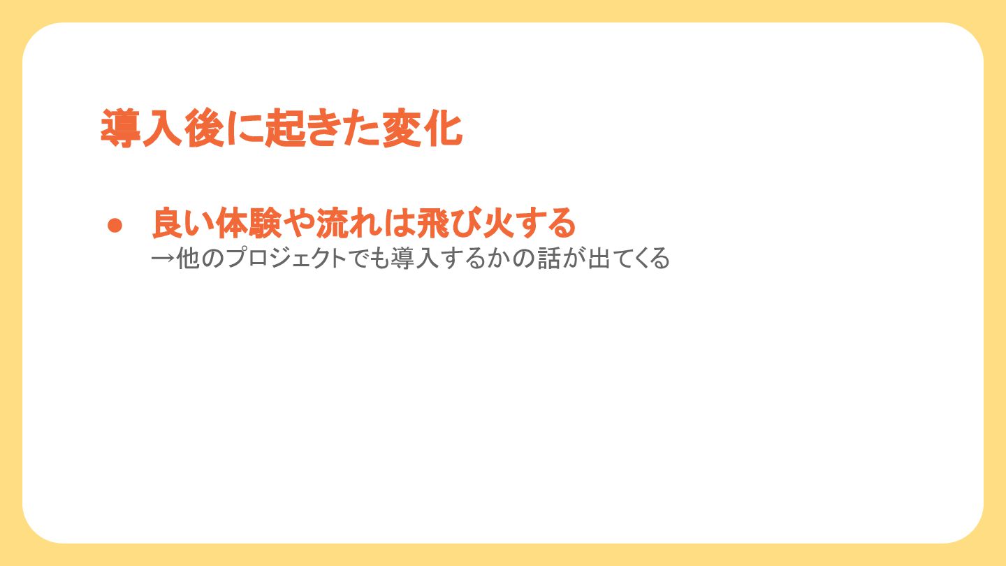 導入後に起きた変化 • 良い体験や流れは飛び火する →他のプロジェクトでも導入するかの話が出てくる