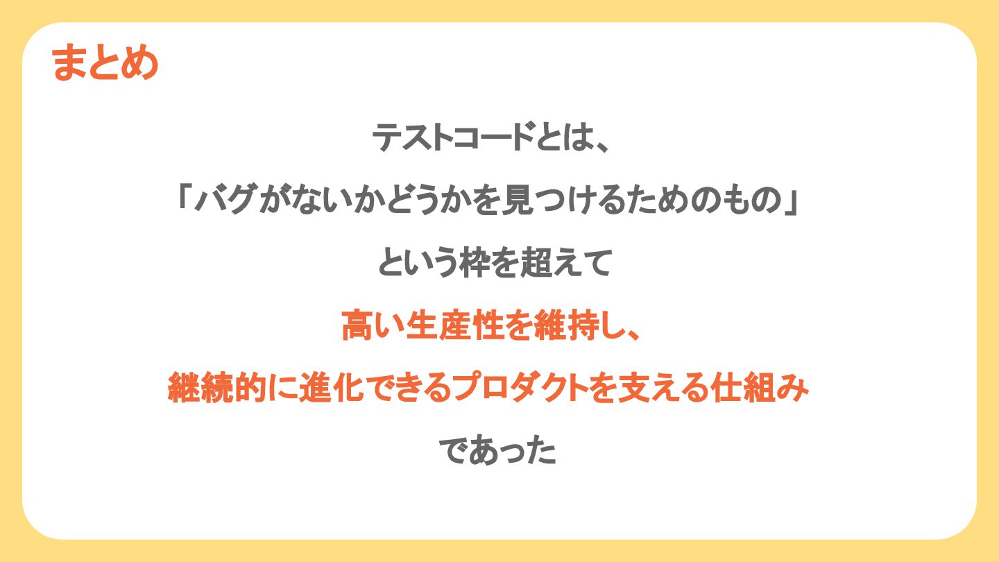 まとめ テストコードとは、 「バグがないかどうかを見つけるためのもの」 という枠を超えて 高い生産性を維持し、 継続的に進化できるプロダクトを支える仕組み であった