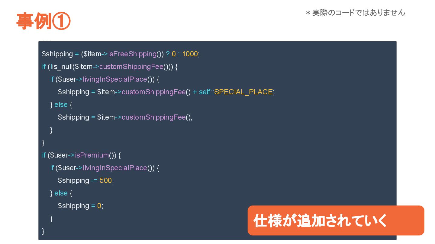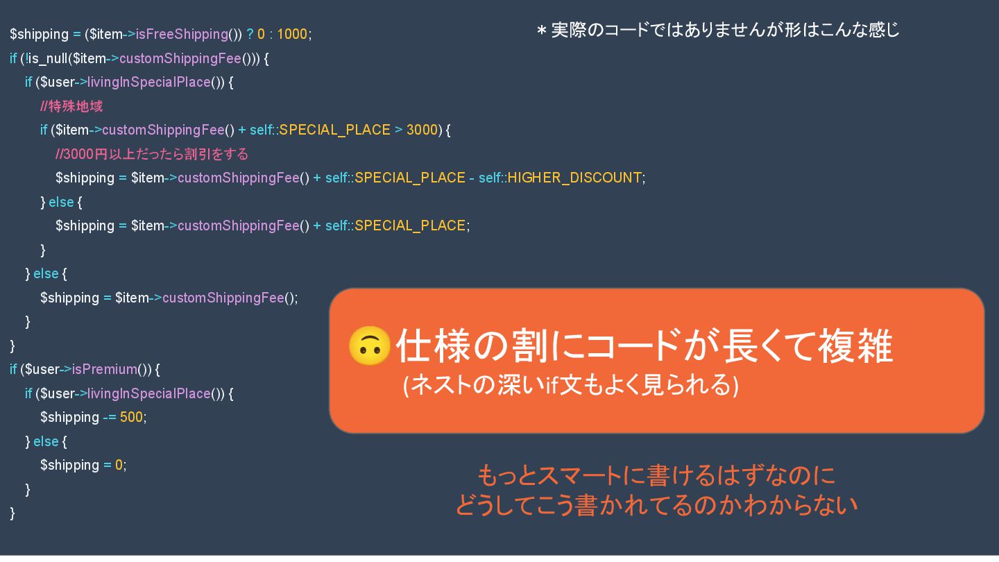 if ($user->livingInSpecialPlace()) { //特殊地域 if ($item->customShippingFee() + self::SPECIAL_PLACE > 3000) { //3000円以上だったら割引をする $shipping = $item->customShippingFee() + self::SPECIAL_PLACE - self::HIGHER_DISCOUNT; } else { $shipping = $item->customShippingFee() + self::SPECIAL_PLACE; } } else { $shipping = $item->customShippingFee(); } } if ($user->isPremium()) { if ($user->livingInSpecialPlace()) { $shipping -= 500; } else { $shipping = 0; } } *実際のコードではありませんが形はこんな感じ 🙃仕様の割にコードが長くて複雑 (ネストの深いif文もよく見られる) もっとスマートに書けるはずなのに どうしてこう書かれてるのかわからない