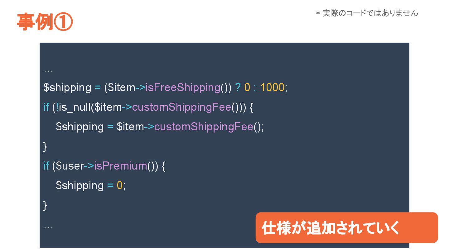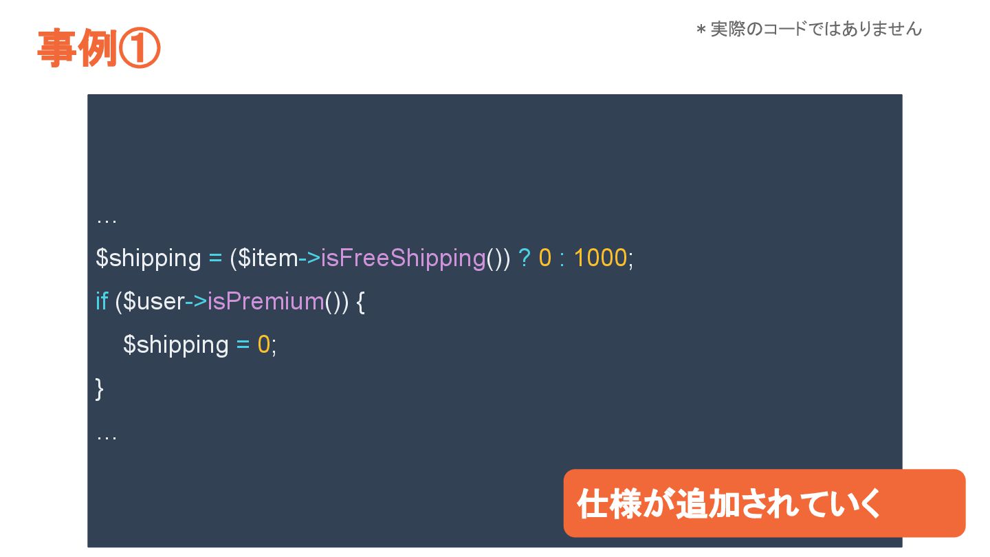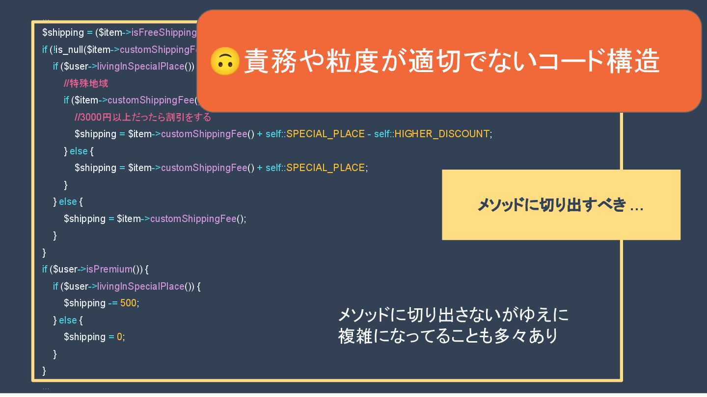 { if ($user->livingInSpecialPlace()) { //特殊地域 if ($item->customShippingFee() + self::SPECIAL_PLACE > 3000) { //3000円以上だったら割引をする $shipping = $item->customShippingFee() + self::SPECIAL_PLACE - self::HIGHER_DISCOUNT; } else { $shipping = $item->customShippingFee() + self::SPECIAL_PLACE; } } else { $shipping = $item->customShippingFee(); } } if ($user->isPremium()) { if ($user->livingInSpecialPlace()) { $shipping -= 500; } else { $shipping = 0; } } … 🙃責務や粒度が適切でないコード構造 メソッドに切り出さないがゆえに 複雑になってることも多々あり メソッドに切り出すべき …