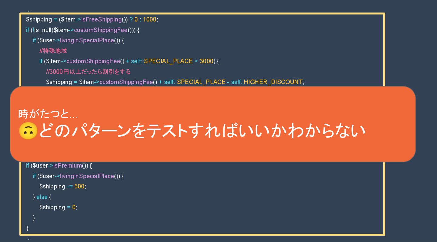 { if ($user->livingInSpecialPlace()) { //特殊地域 if ($item->customShippingFee() + self::SPECIAL_PLACE > 3000) { //3000円以上だったら割引をする $shipping = $item->customShippingFee() + self::SPECIAL_PLACE - self::HIGHER_DISCOUNT; } else { $shipping = $item->customShippingFee() + self::SPECIAL_PLACE; } } else { $shipping = $item->customShippingFee(); } } if ($user->isPremium()) { if ($user->livingInSpecialPlace()) { $shipping -= 500; } else { $shipping = 0; } } … 時がたつと… 🙃どのパターンをテストすればいいかわからない