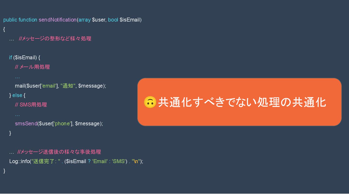 ($isEmail) { // メール用処理 … mail($user['email'], "通知", $message); } else { // SMS用処理 … smsSend($user['phone'], $message); } … //メッセージ送信後の様々な事後処理 Log::info("送信完了: " . ($isEmail ? 'Email' : 'SMS') . "\n"); } 🙃共通化すべきでない処理の共通化