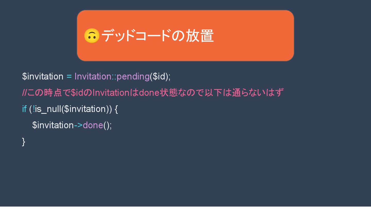 $invitation = Invitation::pending($id); //この時点で$idのInvitationはdone状態なので以下は通らないはず if (!is_null($invitation)) { $invitation->done(); } 🙃デッドコードの放置