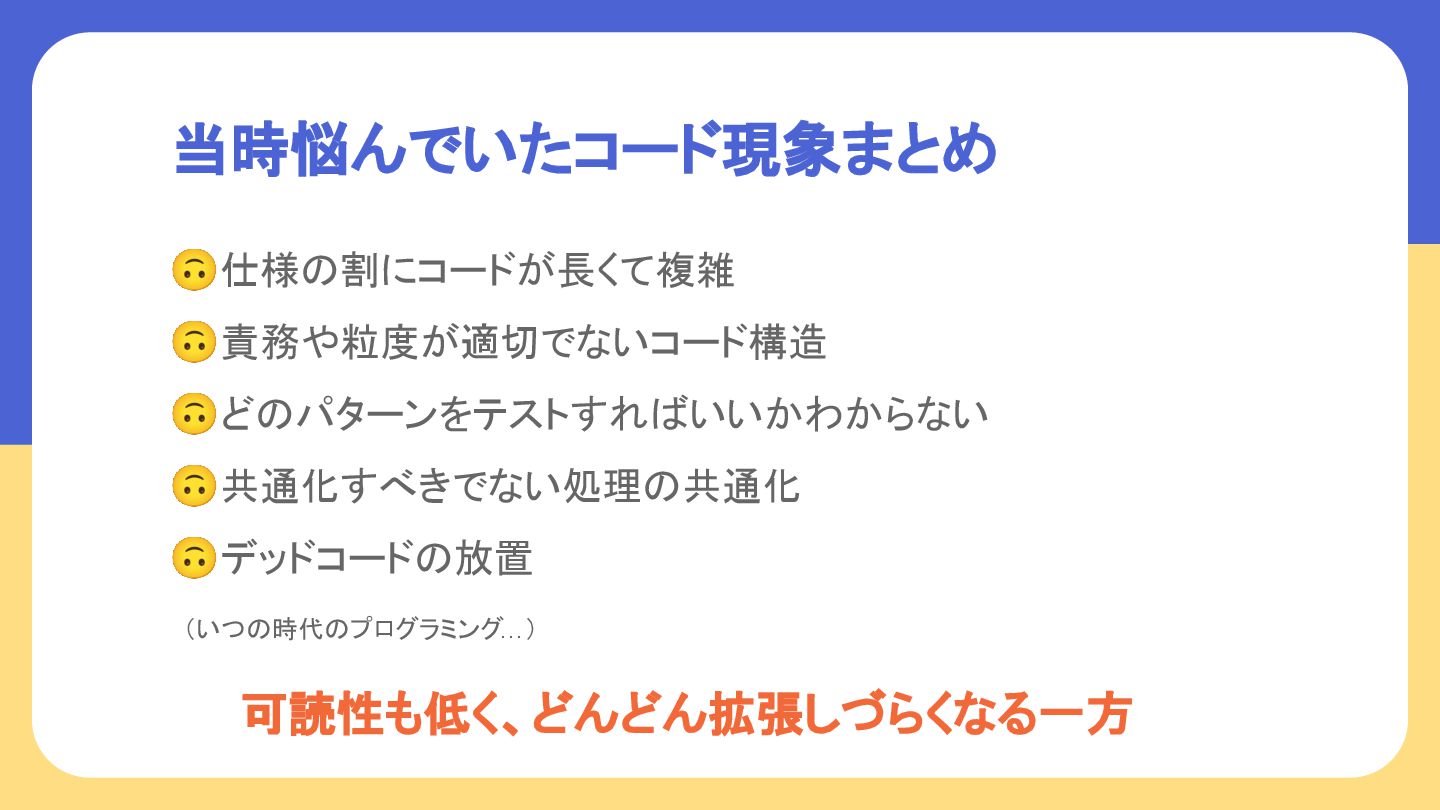 当時悩んでいたコード現象まとめ 🙃仕様の割にコードが長くて複雑 🙃責務や粒度が適切でないコード構造 🙃どのパターンをテストすればいいかわからない 🙃共通化すべきでない処理の共通化 🙃デッドコードの放置 可読性も低く、どんどん拡張しづらくなる一方 (いつの時代のプログラミング …)