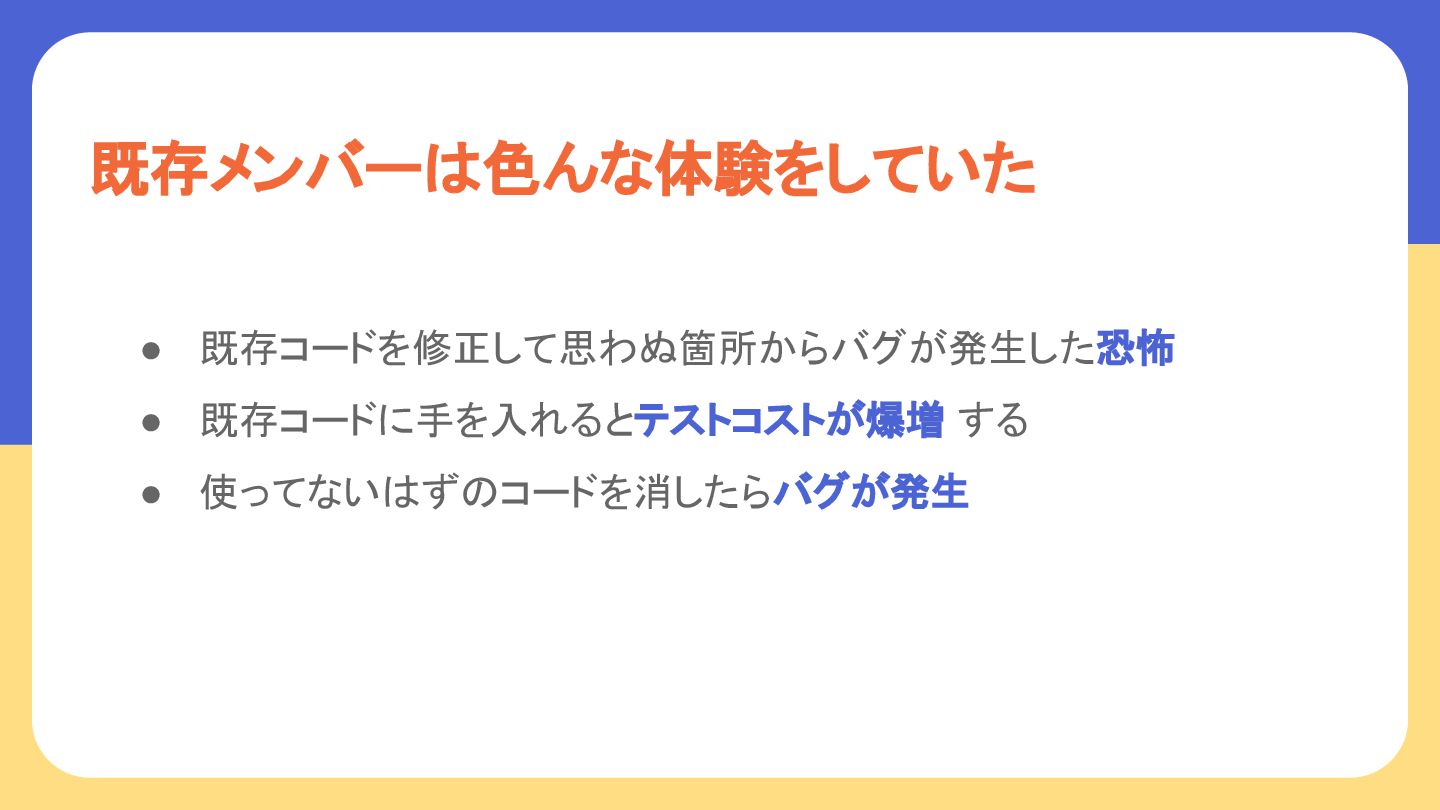 既存メンバーは色んな体験をしていた • 既存コードを修正して思わぬ箇所からバグが発生した恐怖 • 既存コードに手を入れるとテストコストが爆増 する • 使ってないはずのコードを消したらバグが発生