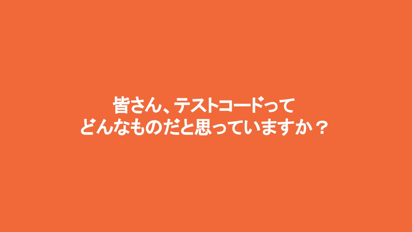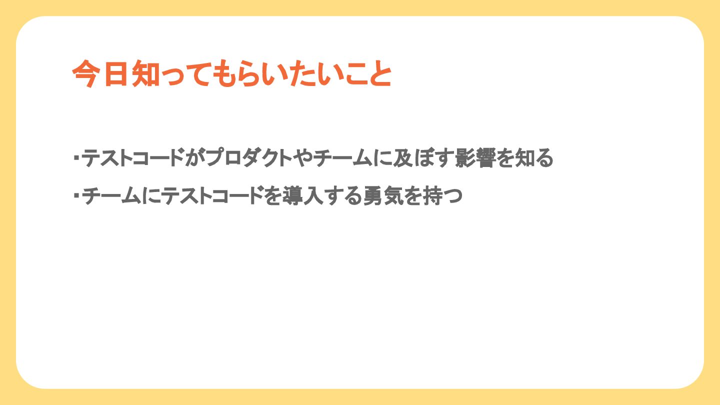 今日知ってもらいたいこと ・テストコードがプロダクトやチームに及ぼす影響を知る ・チームにテストコードを導入する勇気を持つ