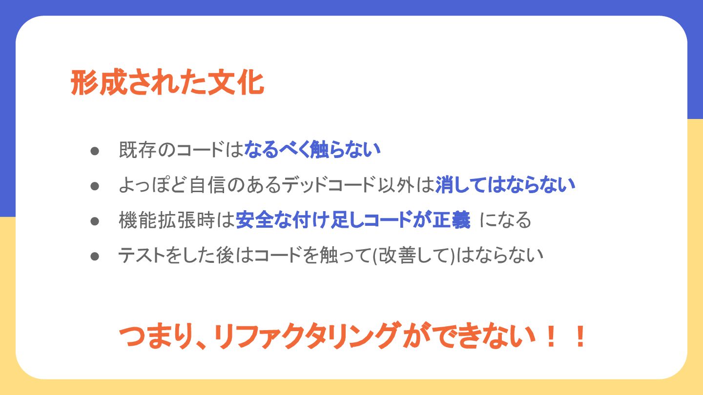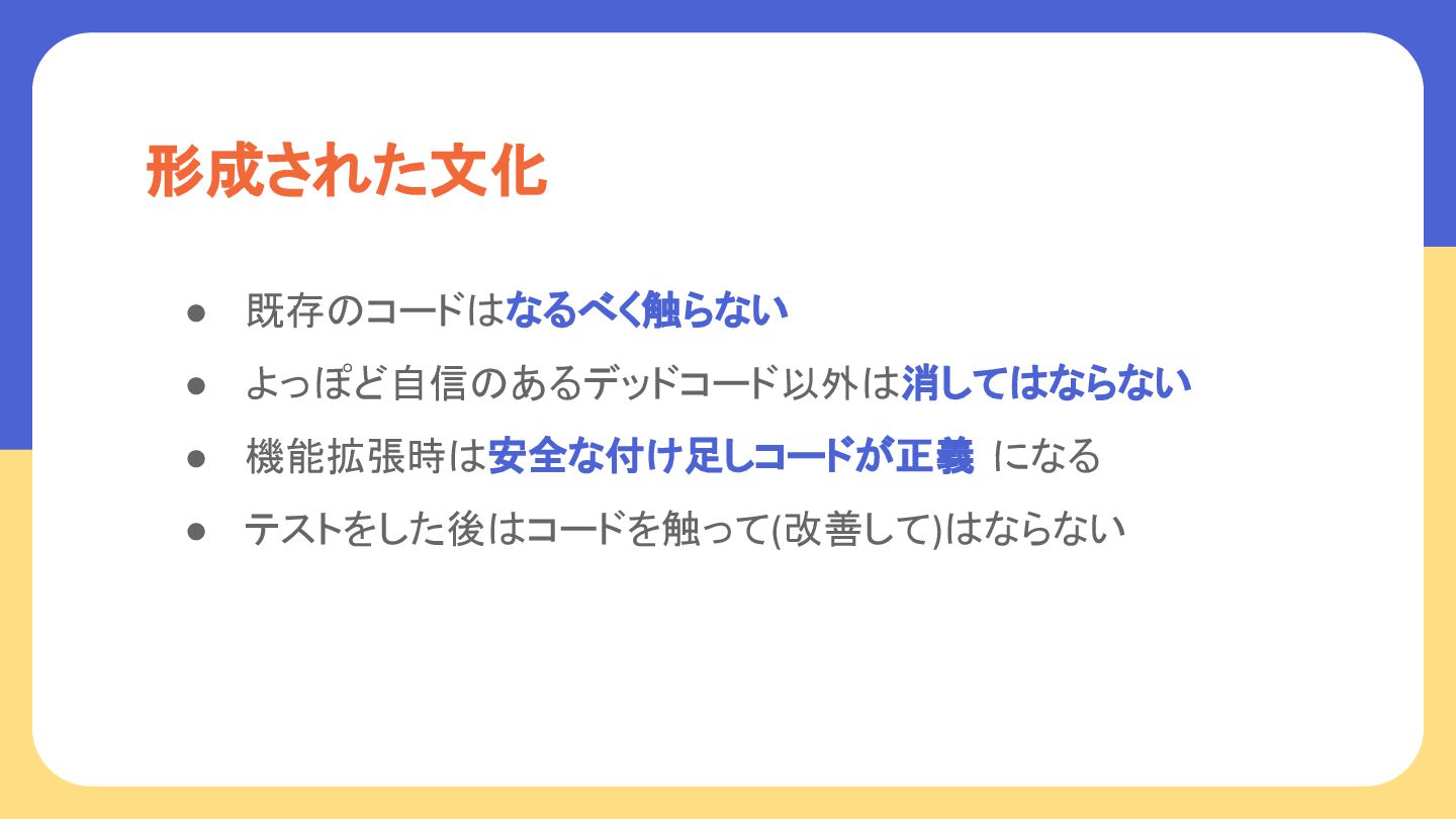 形成された文化 • 既存のコードはなるべく触らない • よっぽど自信のあるデッドコード以外は消してはならない • 機能拡張時は安全な付け足しコードが正義 になる •