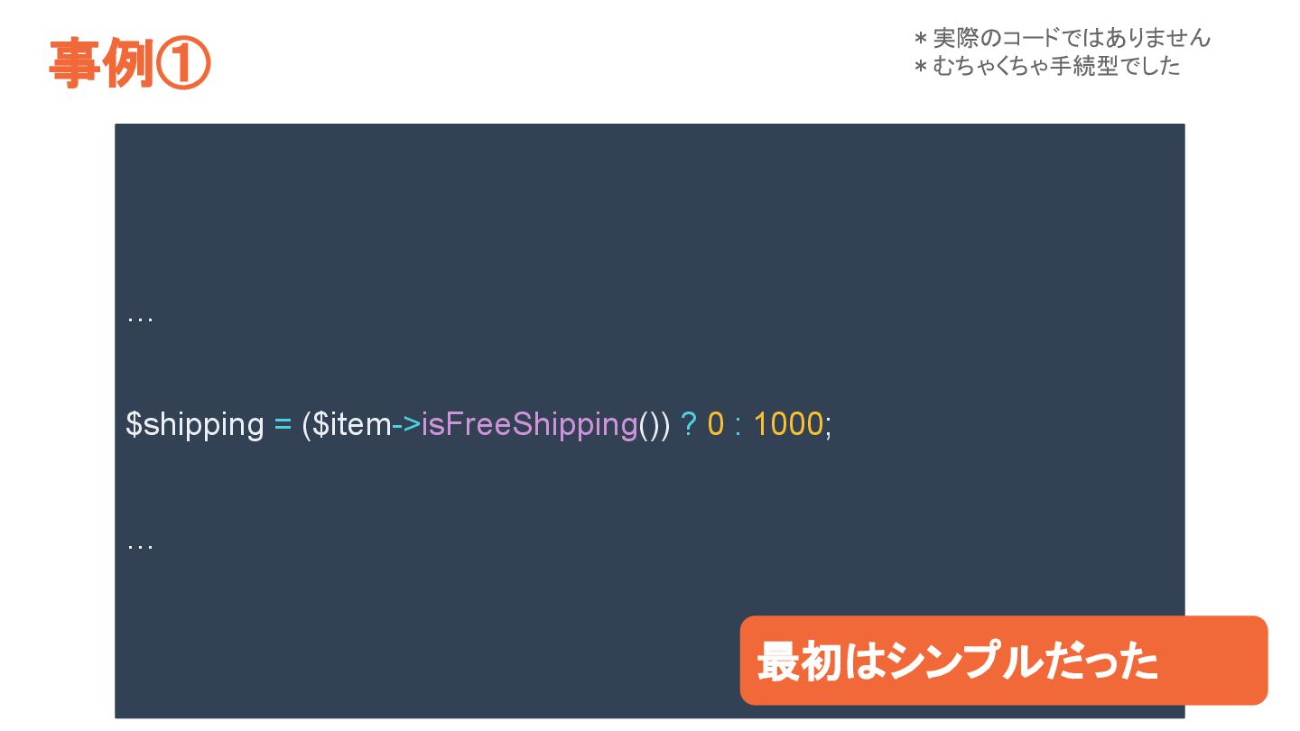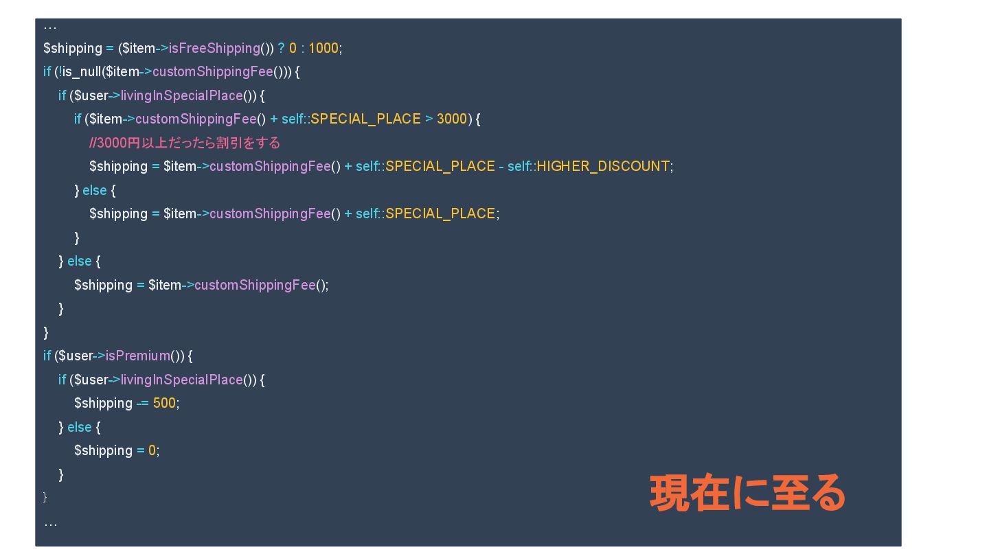 { if ($user->livingInSpecialPlace()) { if ($item->customShippingFee() + self::SPECIAL_PLACE > 3000) { //3000円以上だったら割引をする $shipping = $item->customShippingFee() + self::SPECIAL_PLACE - self::HIGHER_DISCOUNT; } else { $shipping = $item->customShippingFee() + self::SPECIAL_PLACE; } } else { $shipping = $item->customShippingFee(); } } if ($user->isPremium()) { if ($user->livingInSpecialPlace()) { $shipping -= 500; } else { $shipping = 0; } } … 現在に至る
