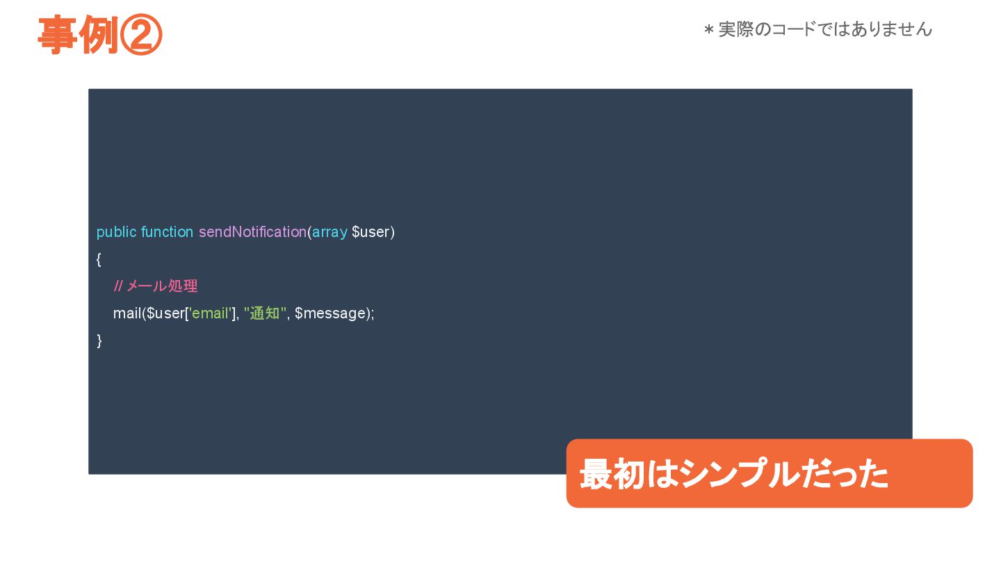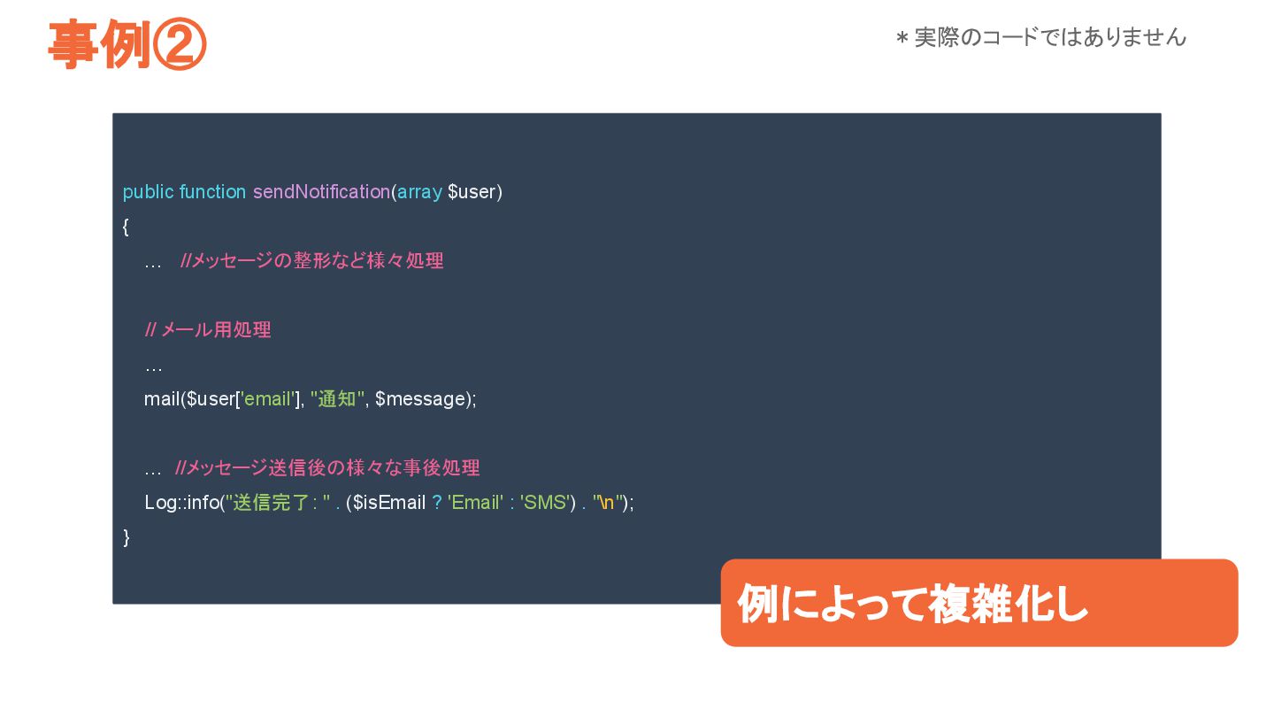 mail($user['email'], "通知", $message); … //メッセージ送信後の様々な事後処理 Log::info("送信完了: " . ($isEmail ? 'Email' : 'SMS') . "\n"); } 事例② *実際のコードではありません 例によって複雑化し