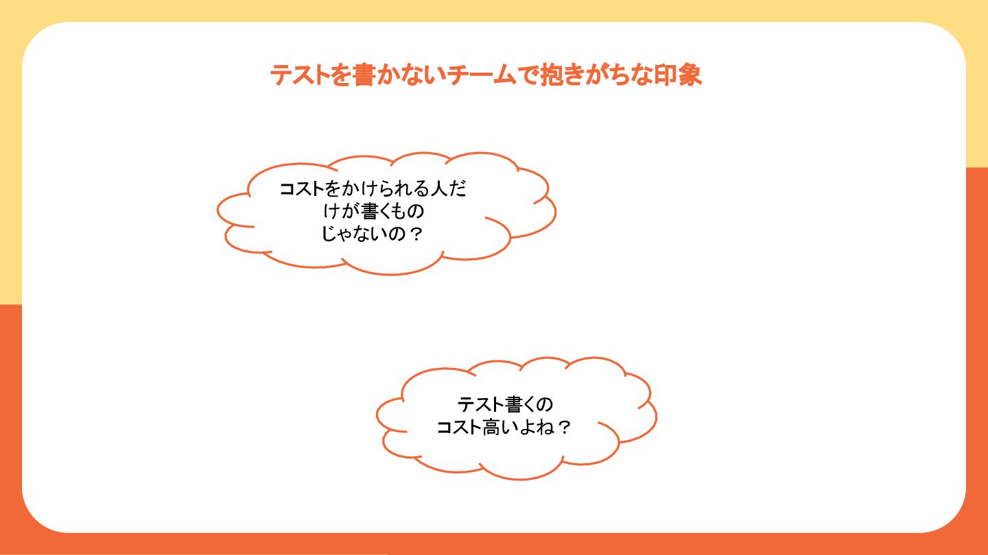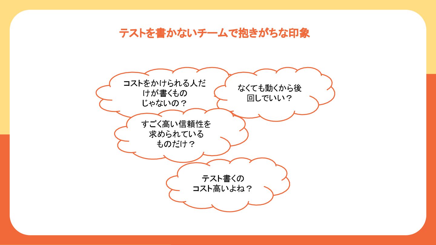 テスト書くの コスト高いよね? コストをかけられる人だ けが書くもの じゃないの? テストを書かないチームで抱きがちな印象