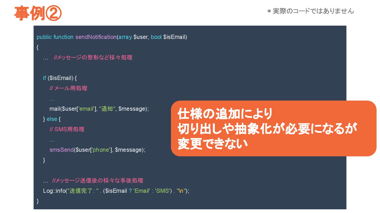 ($isEmail) { // メール用処理 … mail($user['email'], "通知", $message); } else { // SMS用処理 … smsSend($user['phone'], $message); } … //メッセージ送信後の様々な事後処理 Log::info("送信完了: " . ($isEmail ? 'Email' : 'SMS') . "\n"); } 事例② *実際のコードではありません 仕様の追加により 切り出しや抽象化が必要になるが 変更できない
