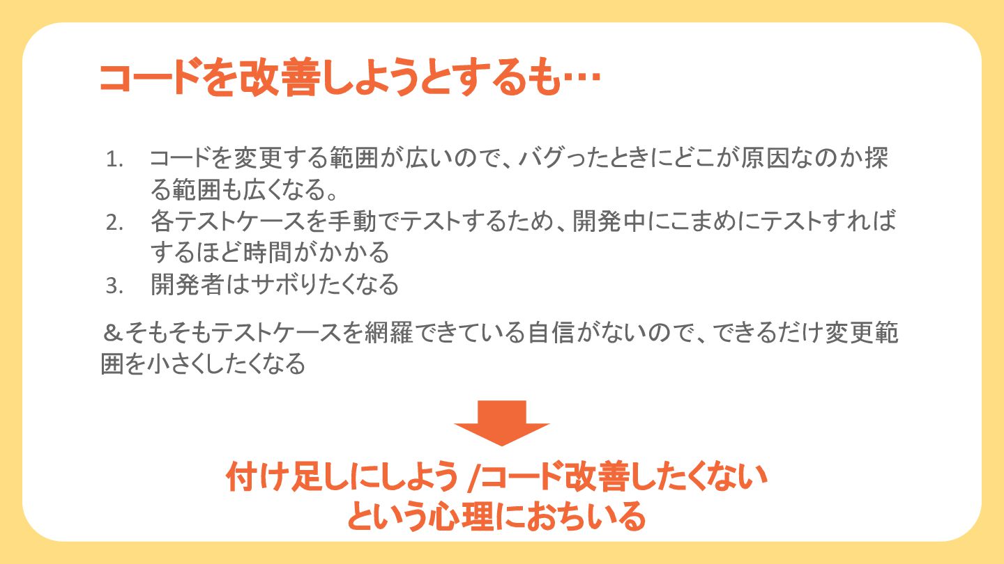 コードを改善しようとするも… 1. コードを変更する範囲が広いので、バグったときにどこが原因なのか探 る範囲も広くなる。 2. 各テストケースを手動でテストするため、開発中にこまめにテストすれば するほど時間がかかる 3. 開発者はサボりたくなる