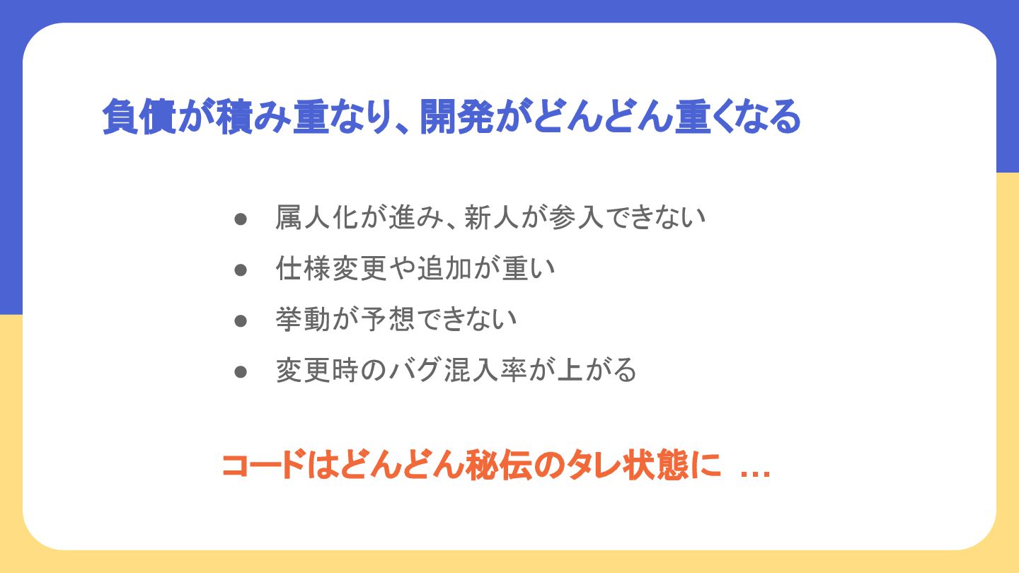 負債が積み重なり、開発がどんどん重くなる • 属人化が進み、新人が参入できない • 仕様変更や追加が重い • 挙動が予想できない • 変更時のバグ混入率が上がる