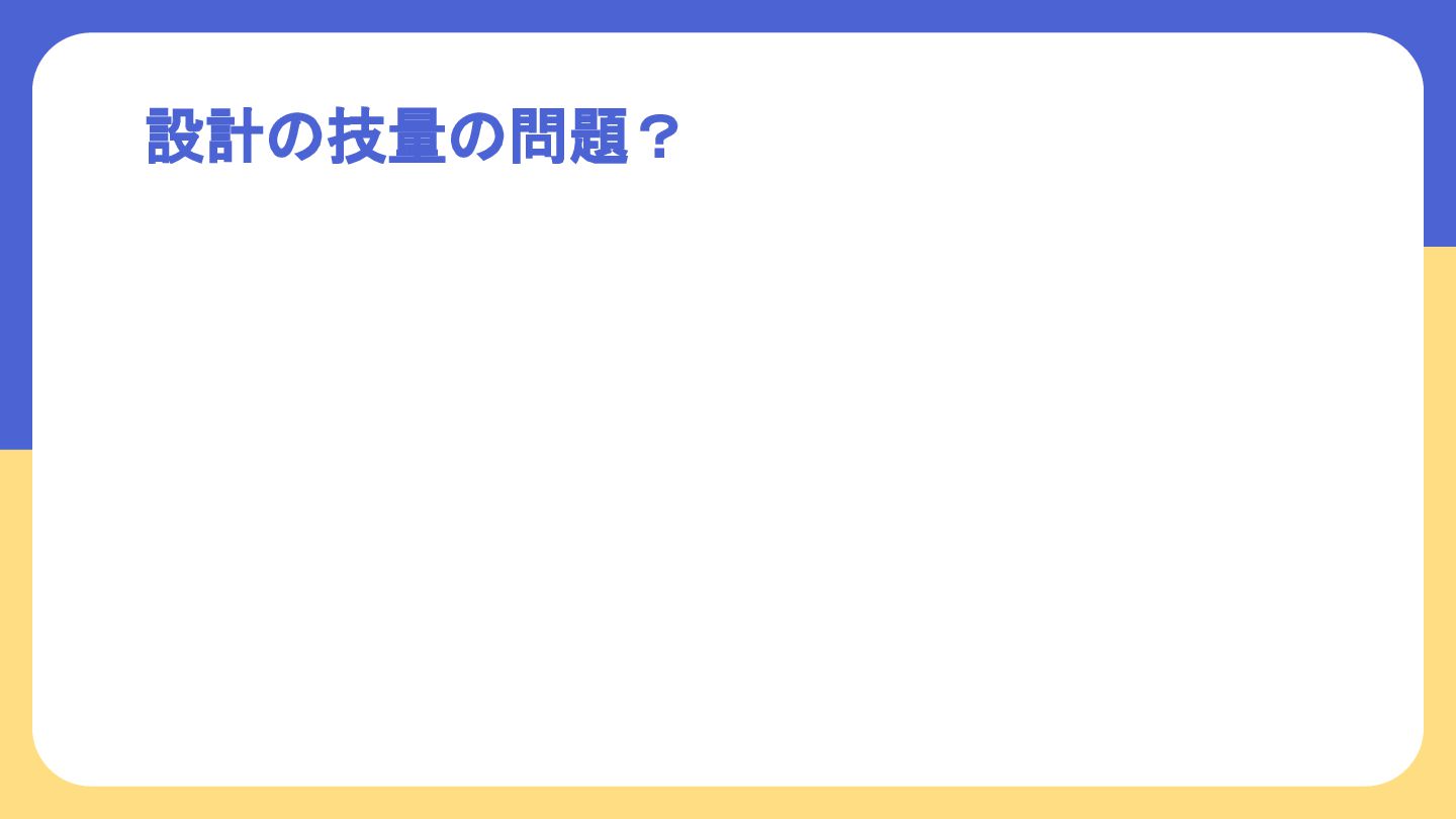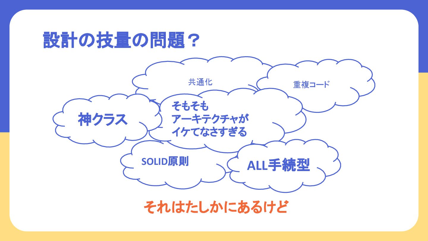 設計の技量の問題? 共通化 SOLID原則 重複コード そもそも アーキテクチャが イケてなさすぎる 神クラス ALL手続型