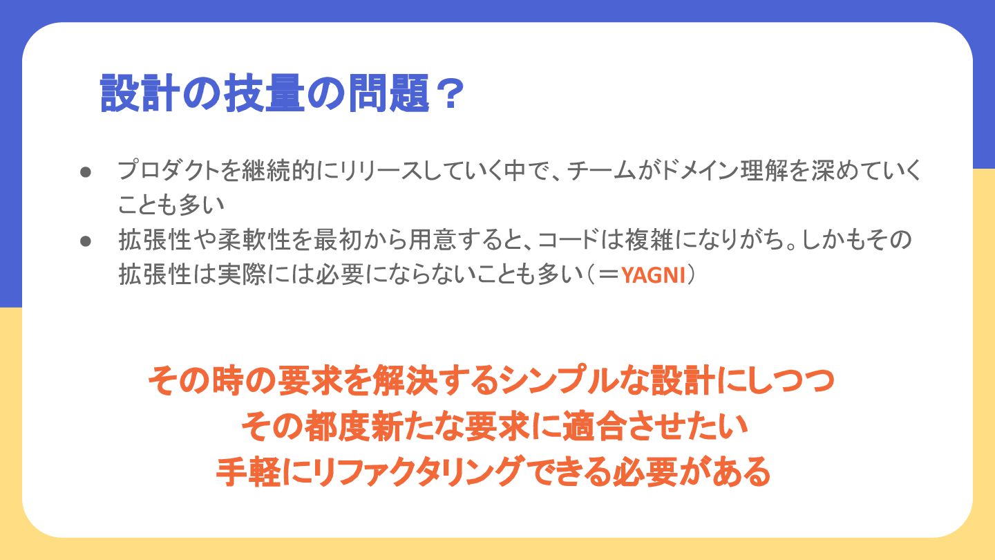 設計の技量の問題? • プロダクトを継続的にリリースしていく中で、チームがドメイン理解を深めていく ことも多い • 拡張性や柔軟性を最初から用意すると、コードは複雑になりがち。しかもその 拡張性は実際には必要にならないことも多い(=YAGNI) その時の要求を解決するシンプルな設計にしつつ その都度新たな要求に適合させたい