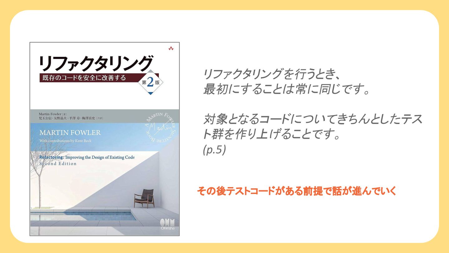 リファクタリングを行うとき、 最初にすることは常に同じです。 対象となるコードについてきちんとしたテス ト群を作り上げることです。 (p.5) その後テストコードがある前提で話が進んでいく