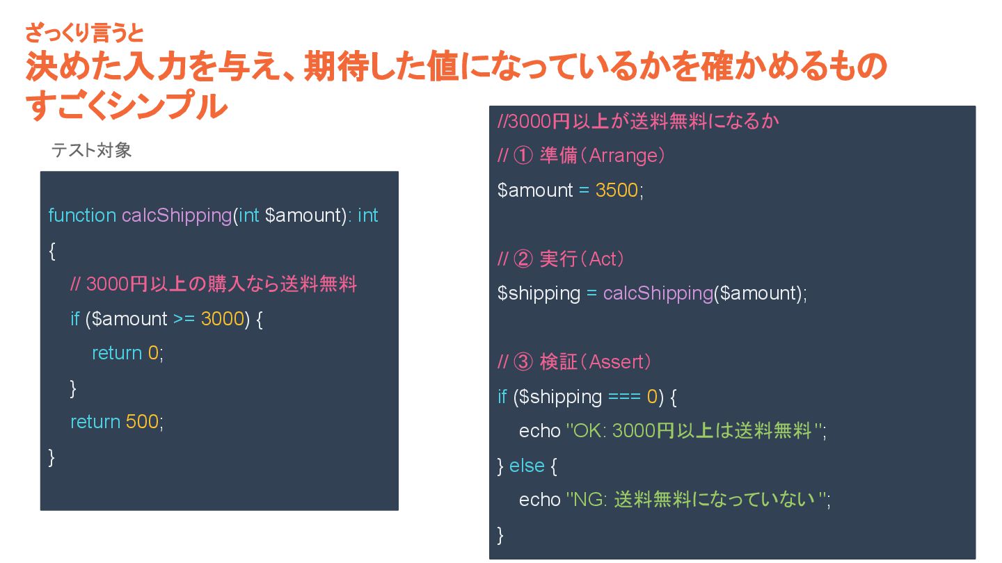 3000) { return 0; } return 500; } //3000円以上が送料無料になるか // ① 準備(Arrange) $amount = 3500; // ② 実行(Act) $shipping = calcShipping($amount); // ③ 検証(Assert) if ($shipping === 0) { echo "OK: 3000円以上は送料無料"; } else { echo "NG: 送料無料になっていない "; } ざっくり言うと 決めた入力を与え、期待した値になっているかを確かめるもの すごくシンプル テスト対象