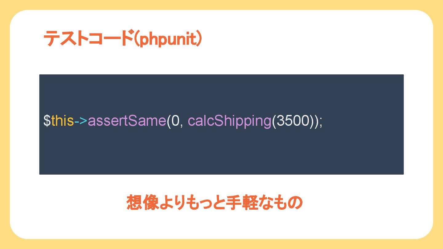 テストコード(phpunit) $this->assertSame(0, calcShipping(3500)); 想像よりもっと手軽なもの